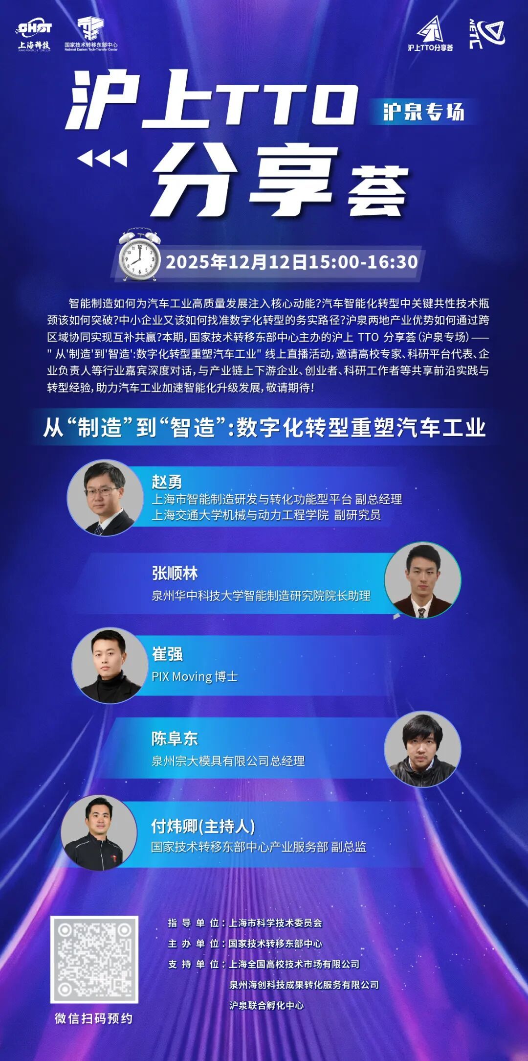 智能制造如何为汽车工业高质量发展注入核心动能?汽车智能化转型中关键共性技术瓶颈该如何突破?中小企业又该如何找准数字化转型的务实路径?沪泉两地产业优势如何通过跨区域协同实现互补共赢?12月12日15:00,国家技术转移东部中心将举办“沪上TTO分享荟(沪泉专场)—— 从'制造'到'智造':数字化转型重塑汽车工业”线上直播活动,邀请高校专家、科研平台代表、企业负责人等行业嘉宾深度对话,与产业链上下游企业、创业者、科研工作者等共享前沿实践与转型经验,助力汽车工业加速智能化升级发展。