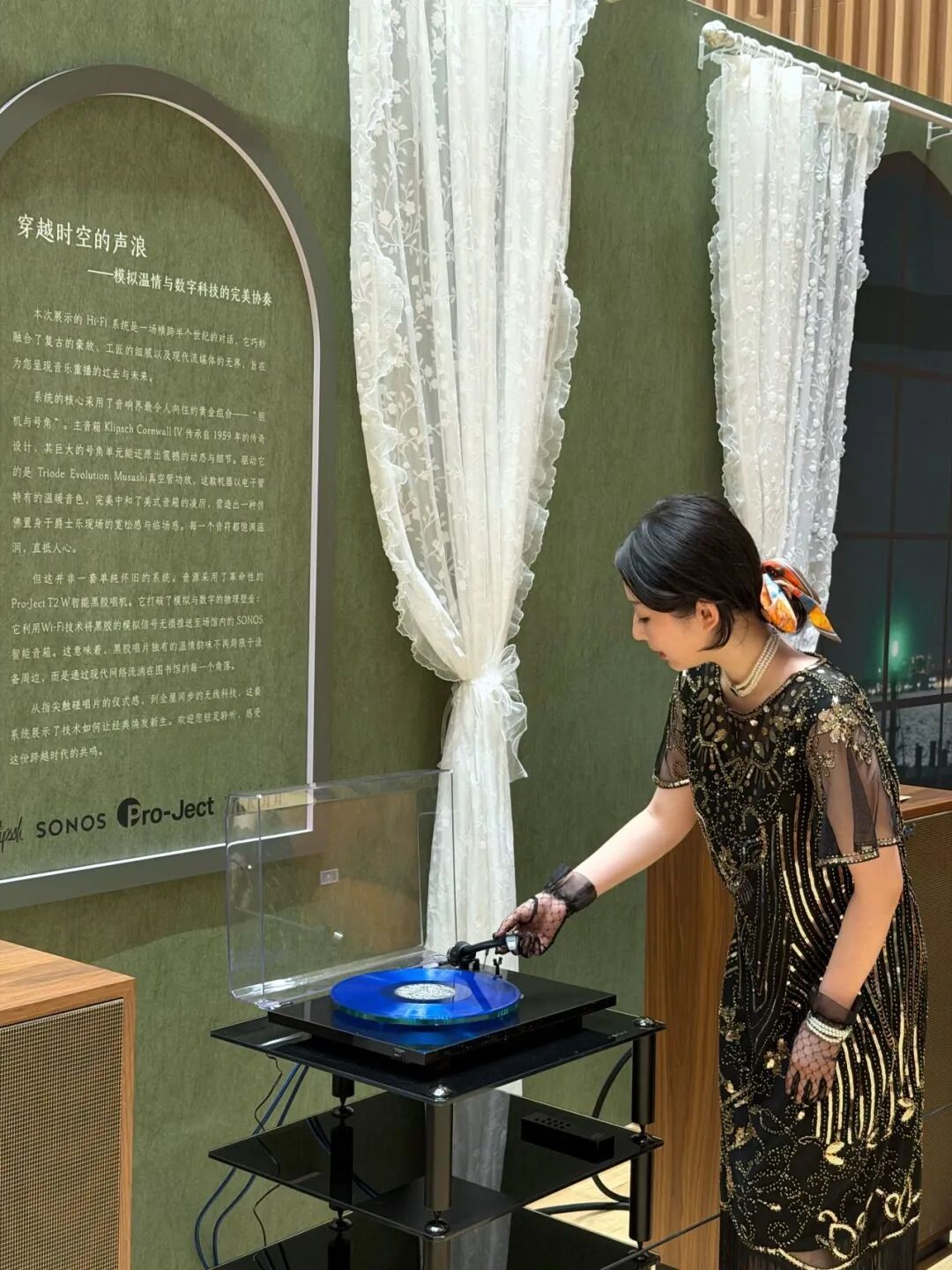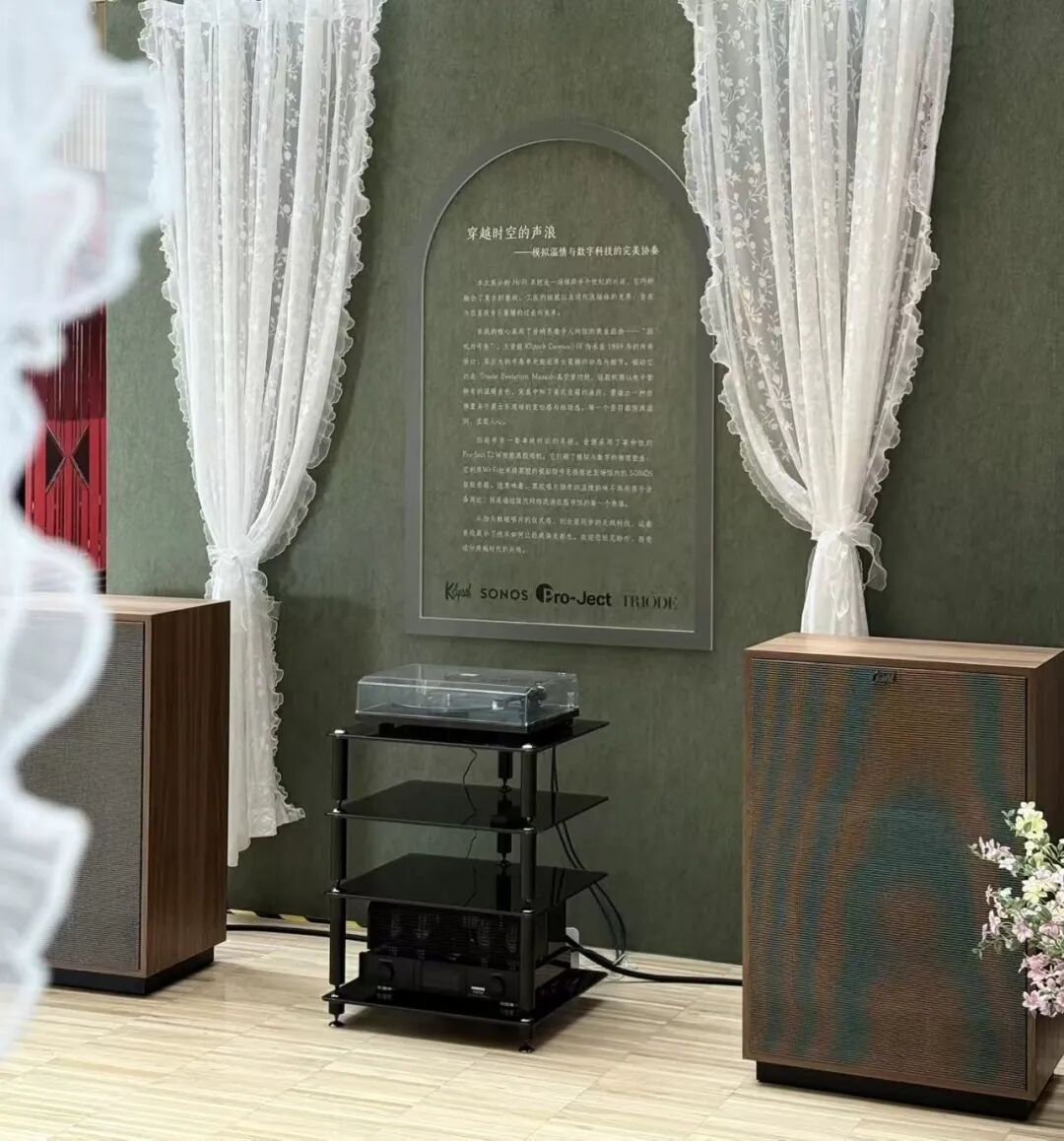 展区陈列了音响界的“胆机与号角”,主音箱 Klipsch Cornwall IV 传承自 1959 年的传奇设计,其巨大的号角单元能还原出震撼的动态与细节。音源搭配Pro-Ject T2 W 智能黑胶唱机,同时通过Wi-Fi 技术,将黑胶的模拟信号无损推送至场馆内的SONOS 智能音箱。