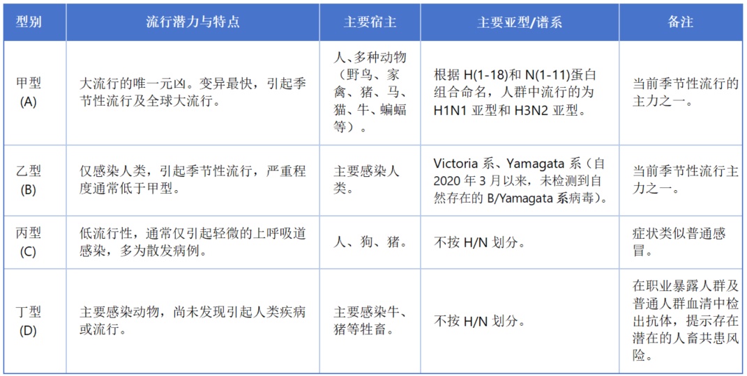 流感病毒并非“单打独斗”,而是有一个庞大的家族,它分为甲(A)、乙(B)、丙(C)、丁(D)四个型,平时引起人群季节性流感的主要由甲、乙型引起。
