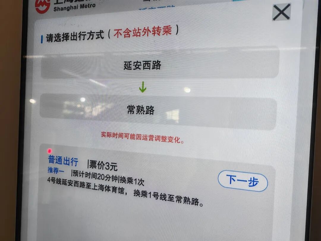 购票时,市民可选择线路或票价,页面会显示全程预估时间和具体换乘信息。 例如,从延安西路站前往常熟路站,页面显示票价3元,预计时间20分钟,换乘1次,4号线延安西路至上海体育馆,换乘1号线至常熟路。