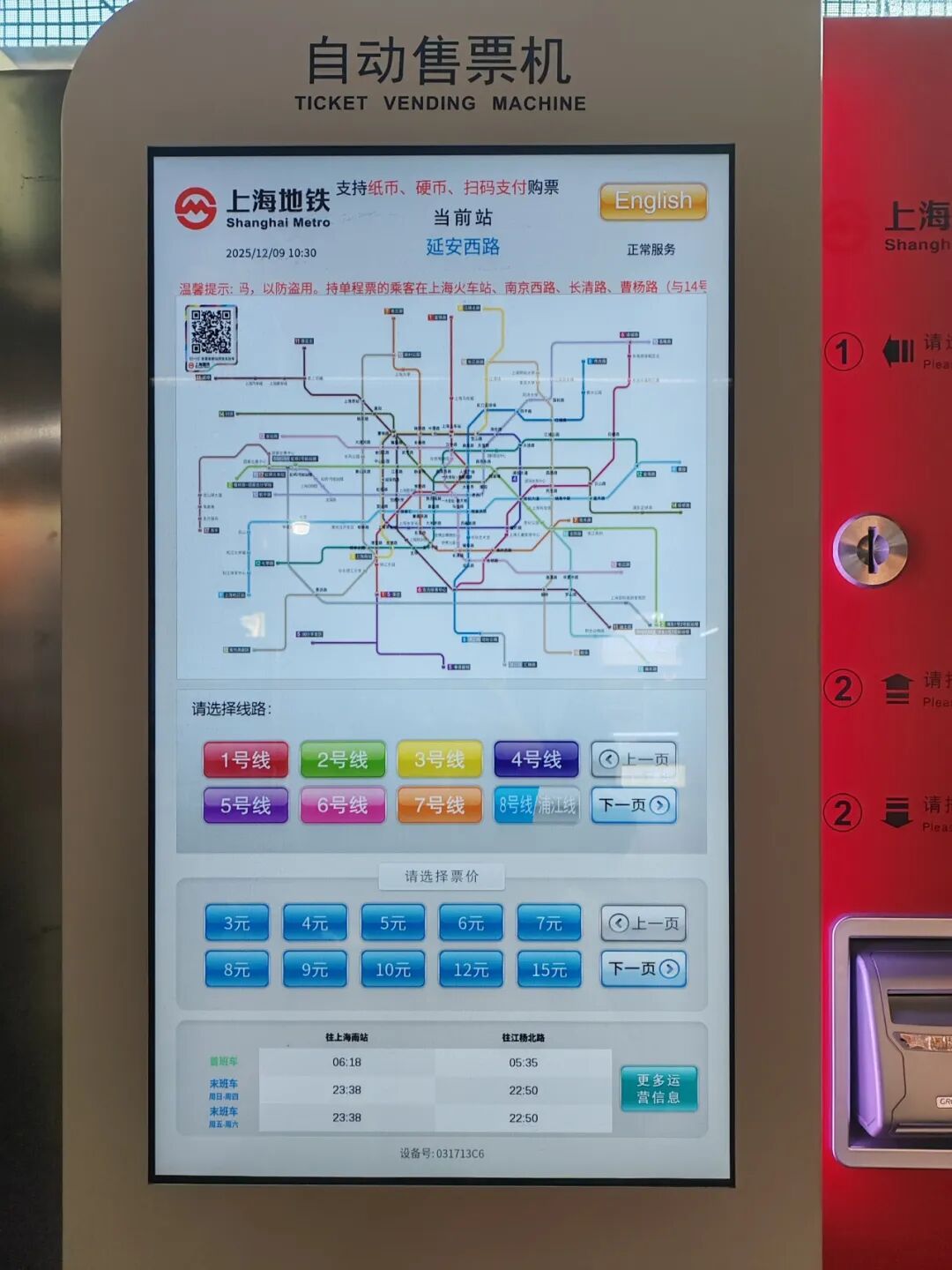 记者注意到,新一代多功能自动售票机主界面不仅提供中文服务,还可以选择英文服务。主界面显示上海轨道交通网络示意图,乘客可根据自身需要选择不同的线路。此外,主界面上还有本站的运营信息,周日至周四、周五周六延安西路站前往上海南站、江杨北路站的首末班车时间。