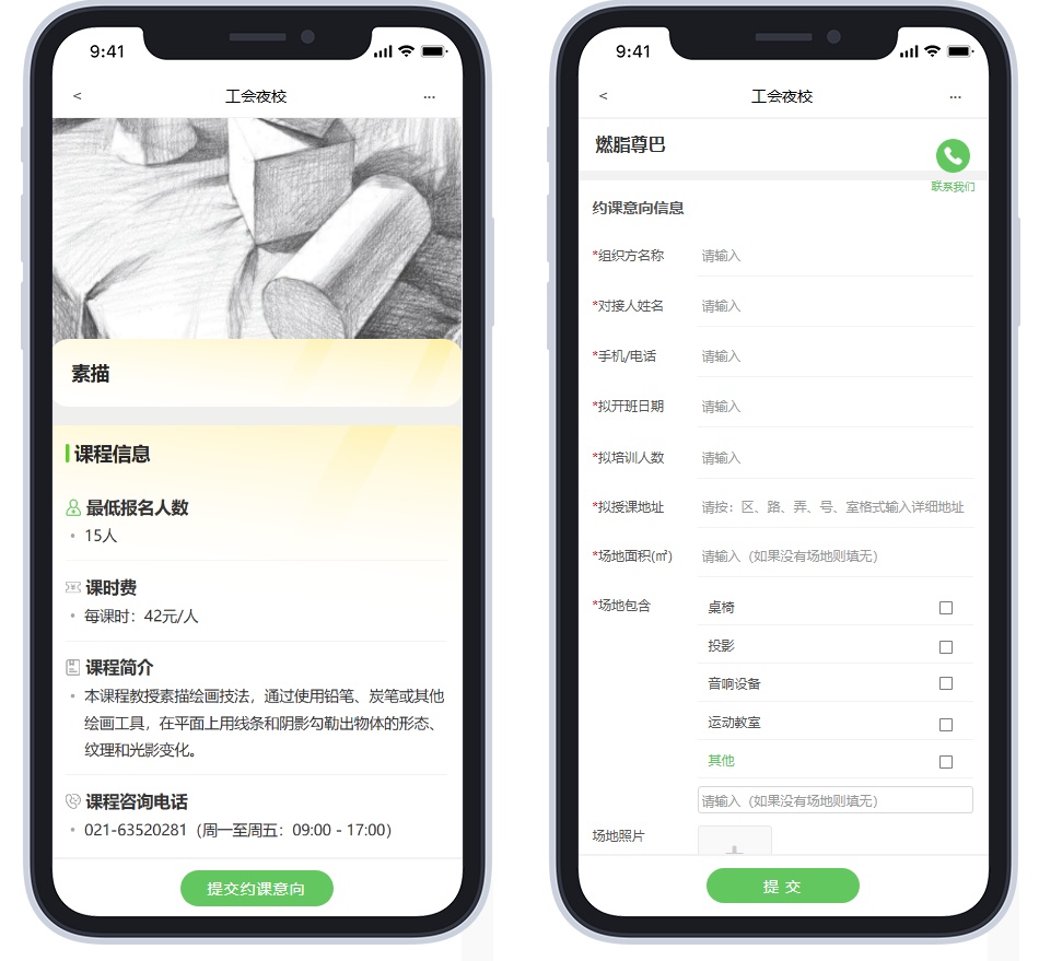 3.点击“提交预约意向”,填写“约课意向信息”并“提交”,工作人员会在5个工作日内联系。