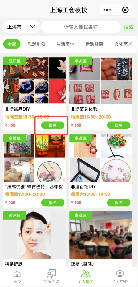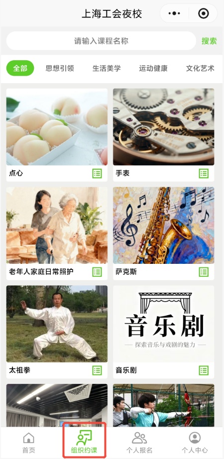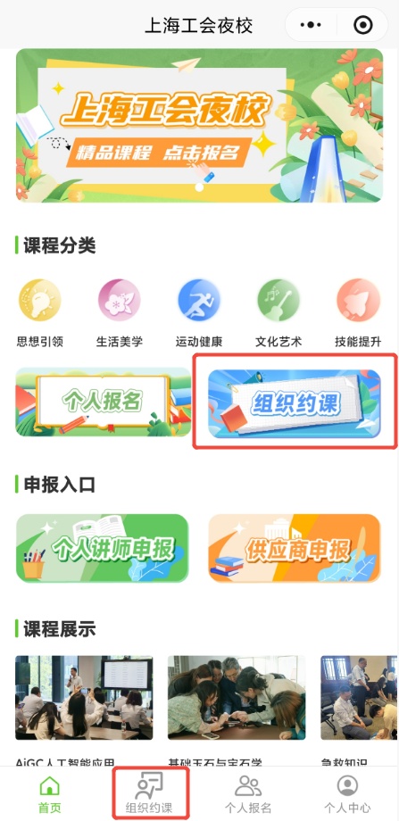 1.进入“工会夜校”小程序,点击“组织约课”版块,同时底部导航栏也有单独入口;