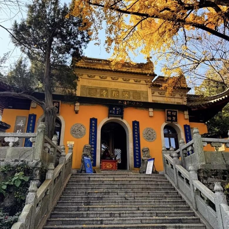 海云禅洞内,有一尊唐彩卧佛像,为江南第一唐彩卧佛,实景极为震撼。寺前的两棵千年古银杏树可以拍照打卡。