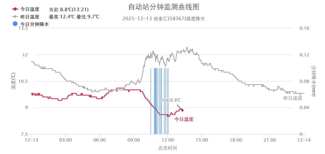 南下的强冷空气前锋今天上午开始影响本市,西北风加大至5级阵风6-7级,沿江沿海地区6级阵风7-8级,阴天小雨加上钻脖子的北风,一下就有了阴司呱嗒的初冬气息。上午起,市区徐家汇站的气温一路下探,白天基本徘徊在8℃附近。