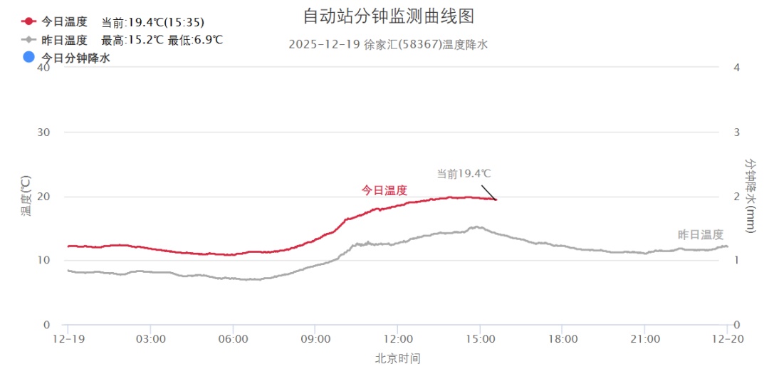 今天的上海再现小阳春体感,早间气温就不低,全市起步7-12℃,午后市区徐家汇站最高气温升至19.8℃。在12月下半月出现近20℃的气温也并不多见,据统计,自2000年以来,也仅有2019年12月16日的日最高气温达到了19.9℃。