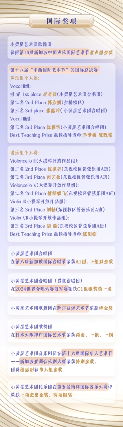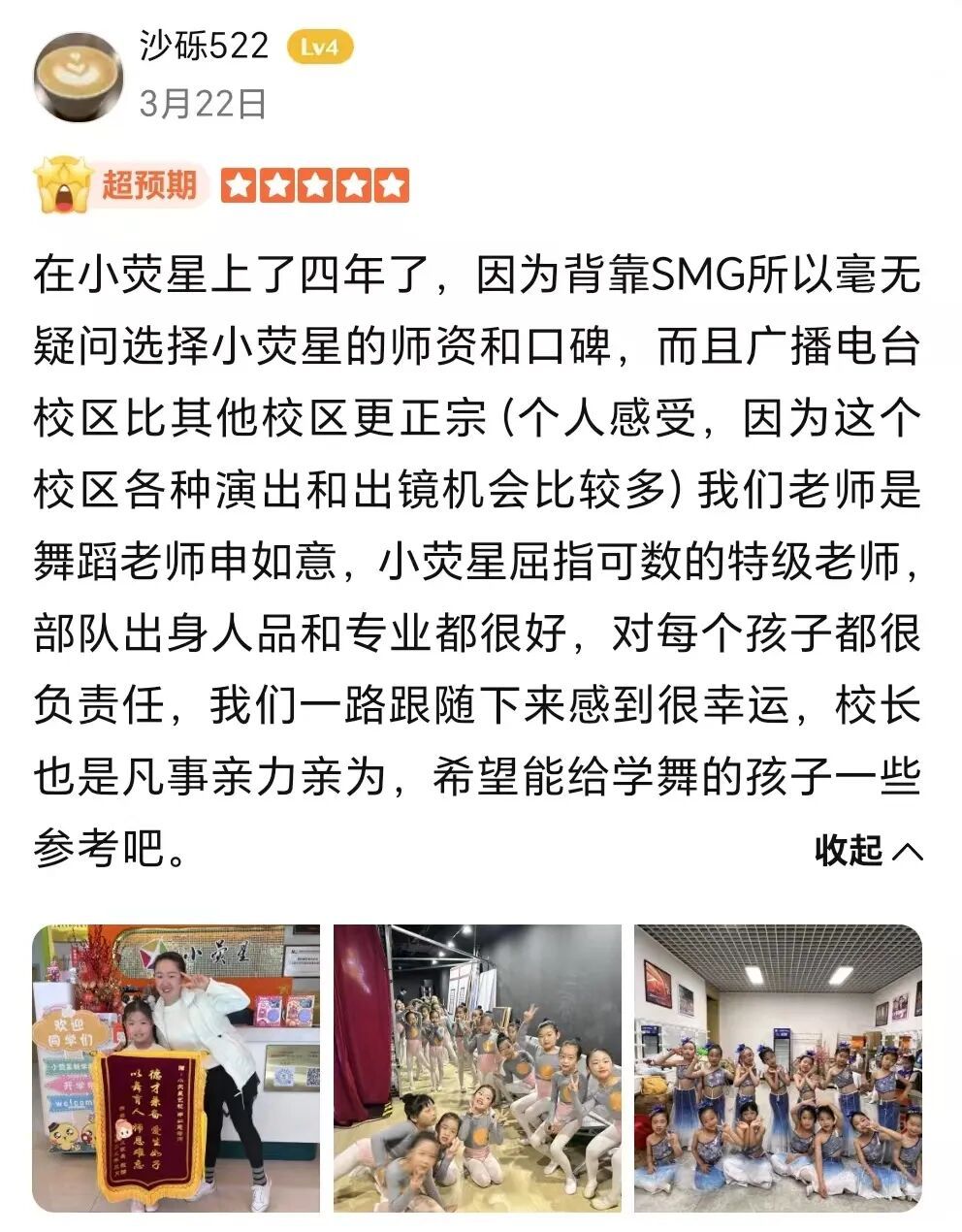 @所有家长 小荧星一年两季招生 快来锁定热门专业名额! 招生年龄:2—14岁 零基础/进阶学习皆可报名 报名请扫描下方二维码: 宝山旗开坊校区地址: 上海市宝山区殷高路65号4幢2楼 宝山友谊路校区地址: 上海市宝山区友谊路160号7幢2层201室 选择小荧星的理由 标杆级专业表现 ◆科班出身+持证上岗 团队教师均来自国内外知名专业艺术院校,不少老师还拥有儿童心理学证书。 ◆明星导师面对面 小荧星与东华大学、上海戏剧学院、上海歌舞团等一流高校以及院团签约,不定期举办大师课、艺术游学、国际交流活动等。 阶梯式课程体系 ◆2岁+启蒙班 游戏化教学激发兴趣,用音乐、律动开启艺术感知 ◆4岁+专业班 分阶段培养孩子从“我能→我敢→我享→我掌控”的能力,塑造艺术表现力、自信心以及敢于突破困境的成长型思维,课程涵盖舞蹈、声乐、主持、器乐等多个门类。 舞蹈 ▂▂ 塑造形体 培养气质 包含中国舞、芭蕾、英皇芭蕾、国标舞、街舞、模特专业 声乐 ▂▂ 培养综合音乐素养 包含声乐(独唱、小组唱)、歌舞、合唱、音乐剧专业 主持 ▂▂ 提升理解表达 培养艺术表现力 包含主持演讲与口才、影视戏剧与表演专业 器乐 ▂▂ 天赋启蒙 提升演奏魅力 包含西洋乐器(小提琴、大提琴、钢琴、架子鼓、铜管、木管等)、民族乐器(古筝、琵琶、柳琴、阮、二胡等)专业 ◆艺术团直通 有机会考入顶尖少儿艺术团——小荧星艺术团,参与国内外演出和影视剧拍摄。 家长安心托付 ◆孩子安全 校区覆盖上海16区,共计26家,无加盟管理,统一配备高标准教学环境,专业设施+专业老师+系统教学。 *不同专业 专用教室 沪上口碑品牌 ◆三代人的童年回忆 小时候看过的少儿春晚,如今娃在台上跳C位。 ◆数十万家庭选择 ◆赛事获奖“专业户” 2024年,小荧星收获国内外奖项共计超300个,其中金奖/特金奖就有46个,获奖学员更有1500+人。 小荧星获奖红榜 向下滑动查看