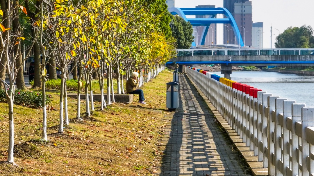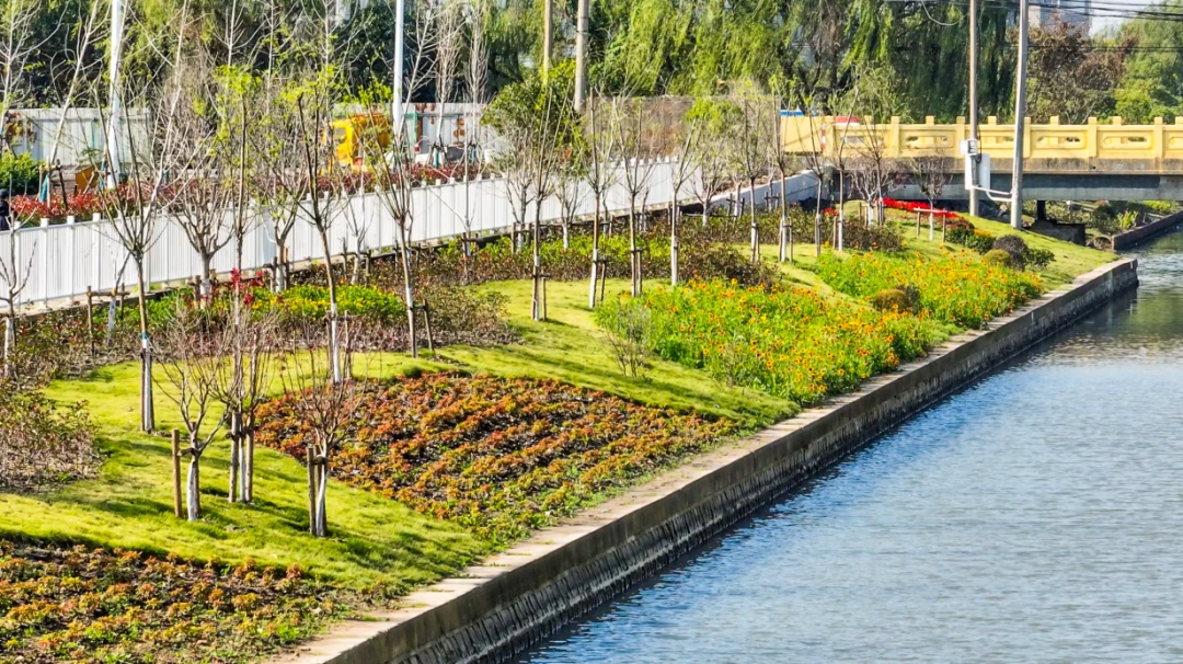 如今,杨家港景观绿化经过全面提升,金桂的金黄、红枫的火红、鸡爪槭的绿意相互交织,成为了杨家港独特的自然符号,形成了水中、岸坡、路边植物的梯度布局。植物与水景相得益彰,赋予了更多的生态魅力与人文气息。