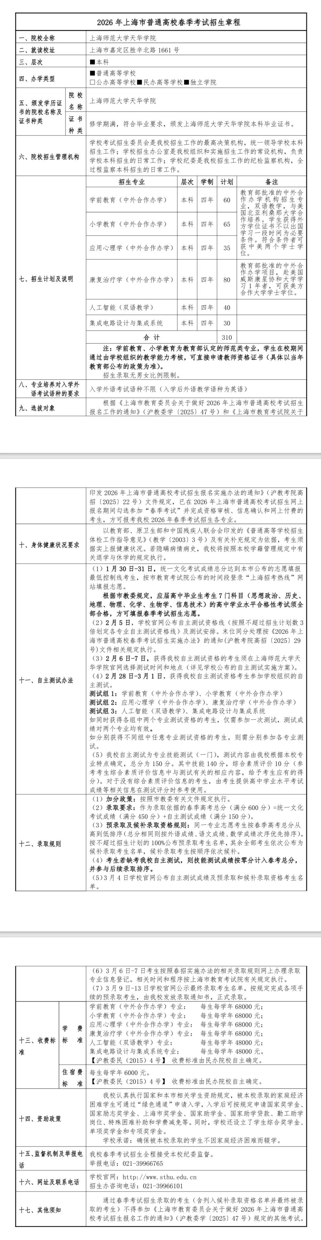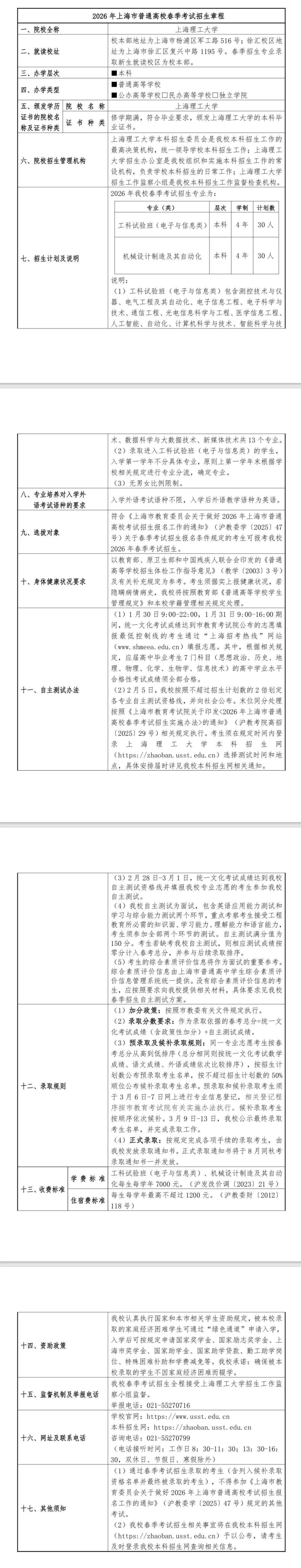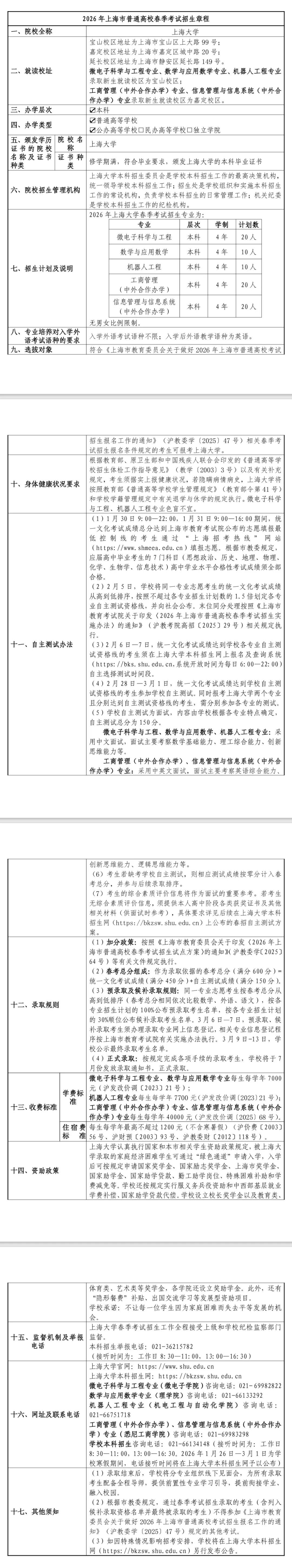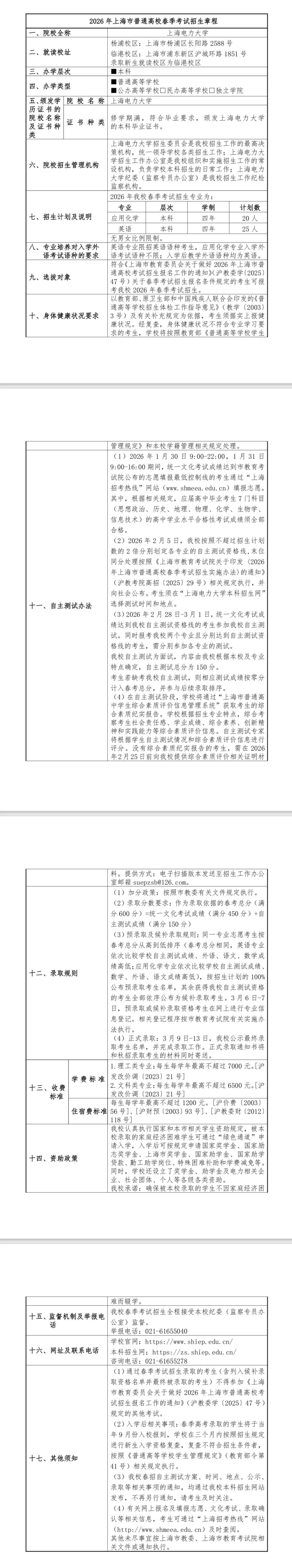 市教委公布2026年上海市普通高校春季考试招生(以下简称“春考”)26所试点院校的招生章程。为方便广大考生及家长掌握信息,小编将26所院校招生简章进行了整理。快来查看心仪院校的招生情况吧! 提醒大家注意:相较去年,部分高校的专业有所调整,请各位考生仔细查看。 上海理工大学 (滑动查看↓) (滑动查看↓) (滑动查看↓) (滑动查看↓) (滑动查看↓) (滑动查看↓) (滑动查看↓) (滑动查看↓) 上海师范大学 (滑动查看↓) (滑动查看↓) (滑动查看↓) (滑动查看↓) (滑动查看↓) (滑动查看↓) (滑动查看↓) (滑动查看↓) (滑动查看↓) (滑动查看↓) (滑动查看↓) (滑动查看↓) (滑动查看↓) (滑动查看↓) (滑动查看↓) (滑动查看↓) (滑动查看↓) (滑动查看↓) 资料:上海教育、上海发布 编辑:王雨思 点击“阅读原文”查看原文件