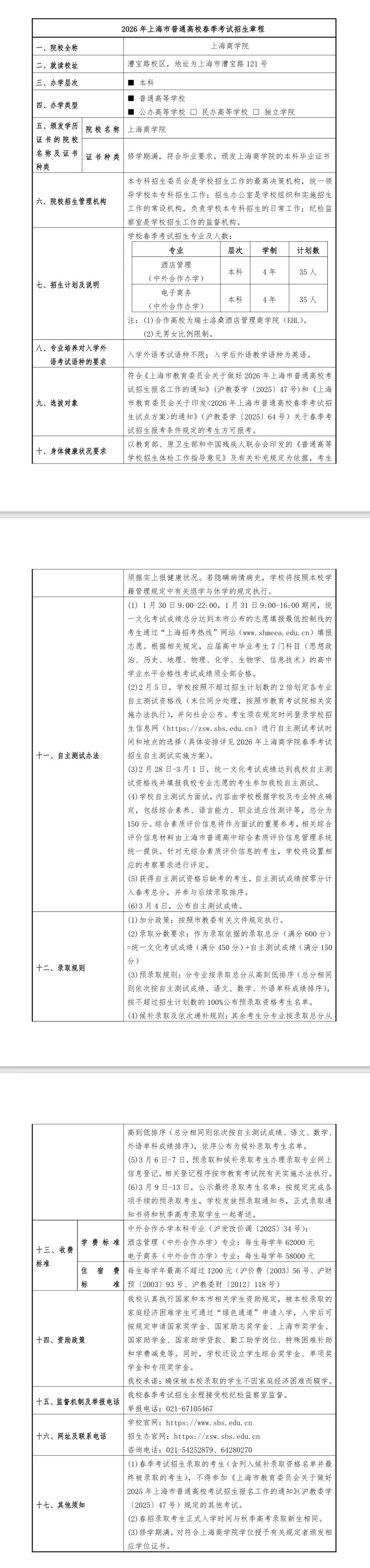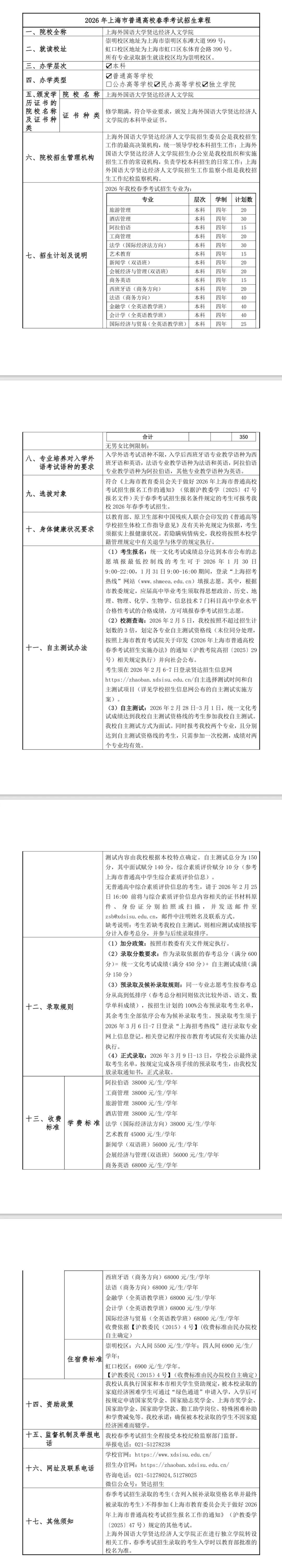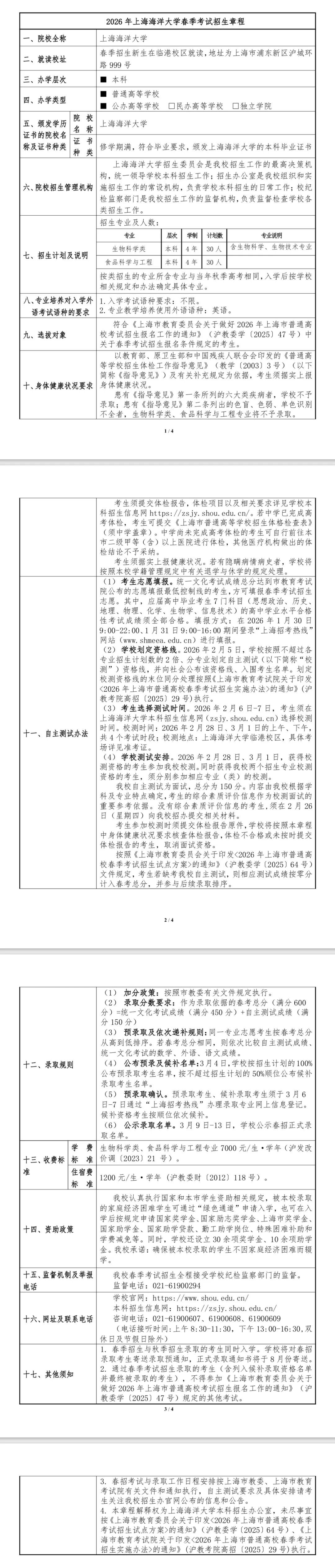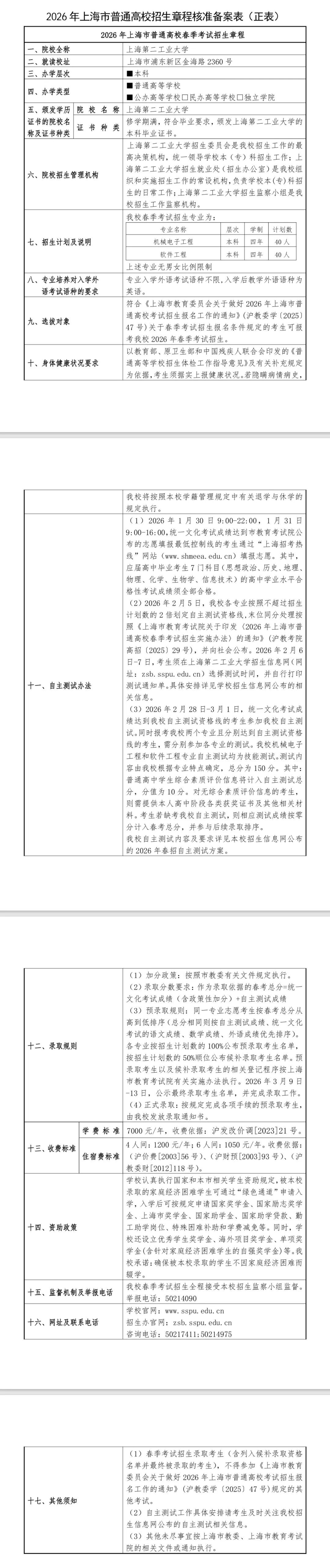 市教委公布2026年上海市普通高校春季考试招生(以下简称“春考”)26所试点院校的招生章程。为方便广大考生及家长掌握信息,小编将26所院校招生简章进行了整理。快来查看心仪院校的招生情况吧! 提醒大家注意:相较去年,部分高校的专业有所调整,请各位考生仔细查看。 上海理工大学 (滑动查看↓) (滑动查看↓) (滑动查看↓) (滑动查看↓) (滑动查看↓) (滑动查看↓) (滑动查看↓) (滑动查看↓) 上海师范大学 (滑动查看↓) (滑动查看↓) (滑动查看↓) (滑动查看↓) (滑动查看↓) (滑动查看↓) (滑动查看↓) (滑动查看↓) (滑动查看↓) (滑动查看↓) (滑动查看↓) (滑动查看↓) (滑动查看↓) (滑动查看↓) (滑动查看↓) (滑动查看↓) (滑动查看↓) (滑动查看↓) 资料:上海教育、上海发布 编辑:王雨思 点击“阅读原文”查看原文件