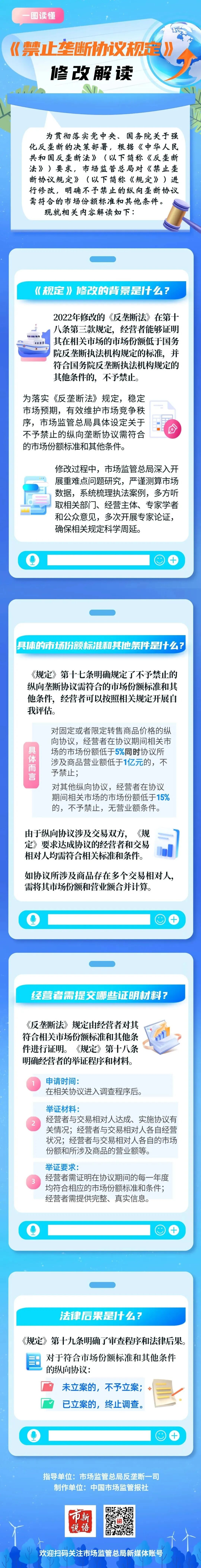 为贯彻落实党中央、国务院关于强化反垄断的决策部署,有效维护市场竞争秩序,近日市场监管总局修改《禁止垄断协议规定》,明确不予禁止的纵向垄断协议需符合的市场份额标准和其他条件,将于2026年2月1日起施行。