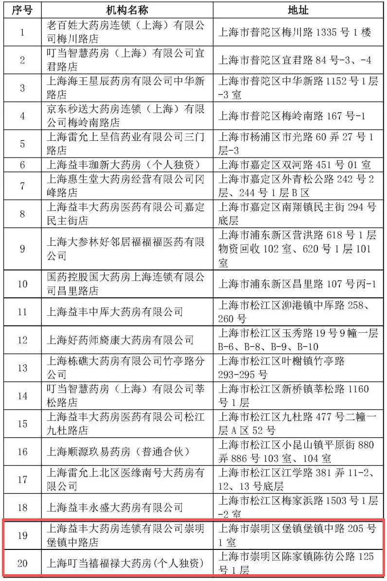 市医保局介绍,根据国家及本市定点医药机构协议管理的有关规定,经市、区两级经办机构组织评估,拟将4家医疗机构、20家零售药店纳入定点,其中崇明有2家药店纳入拟新增医保定点零售药店名单。现公示如下↓