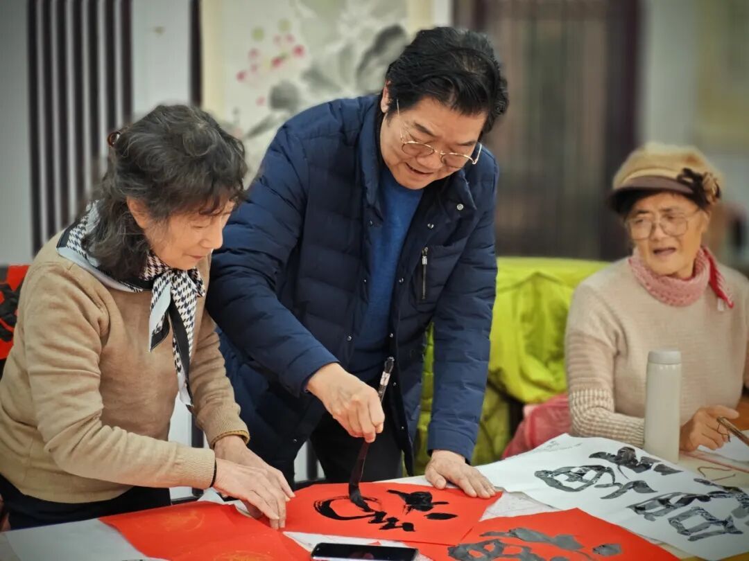 动手体验环节,居民们在两位老师的巡回指导下,提笔挥毫,沉浸于笔墨纸砚带来的宁静与乐趣之中。