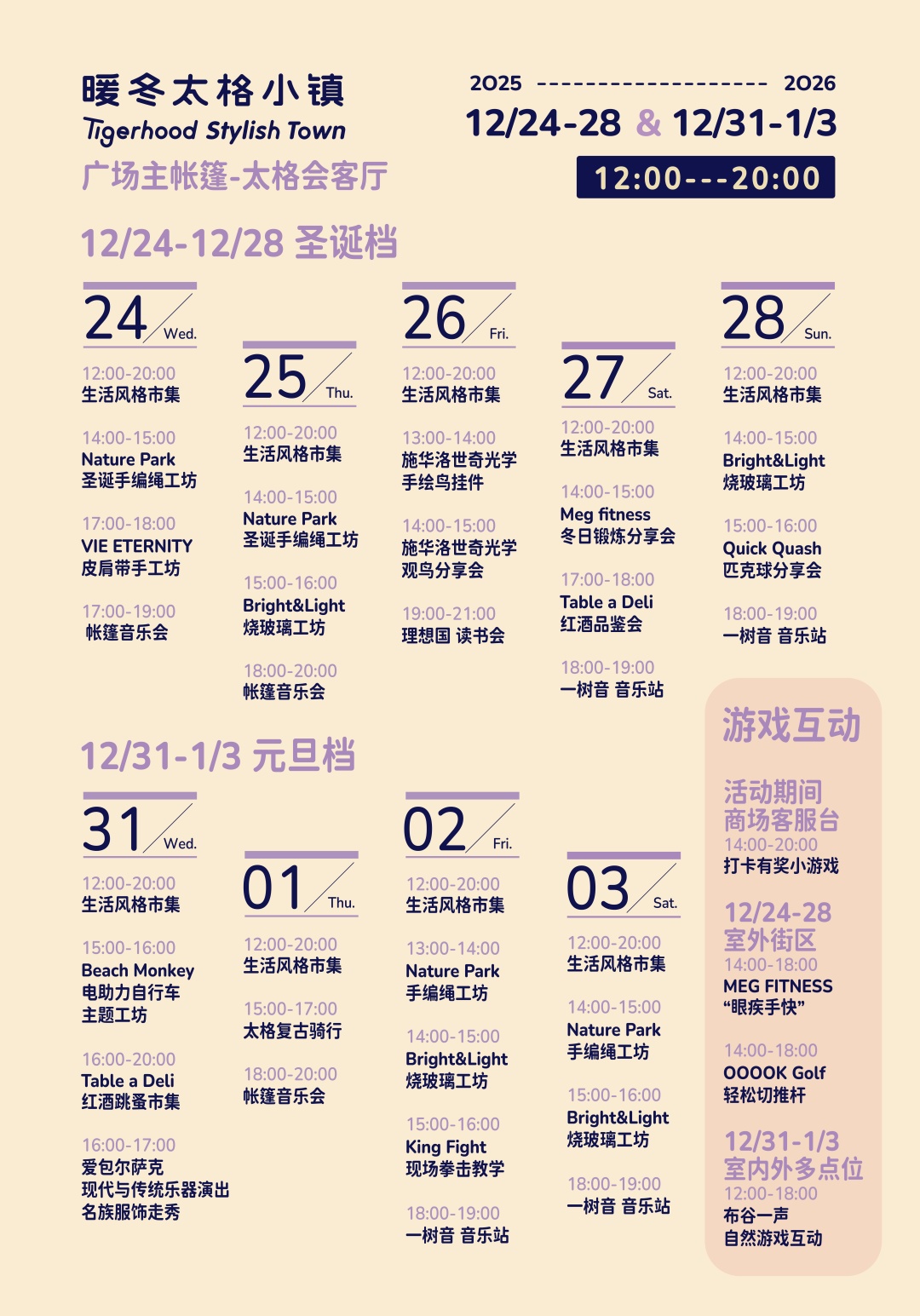 ,将自然里的户外节首次搬进都市,不仅有北欧节日的篝火、山野手作的温度,还集结一众生活方式与户外品牌,带来岁末迎新聚会新玩法。连续9天(2025年12月24日—28日、2025年12月31日—2026年1月3日),每天12点到20点,免费入场,欢聚不重样,让岁末迎新的每一天都充满新鲜感与仪式感。