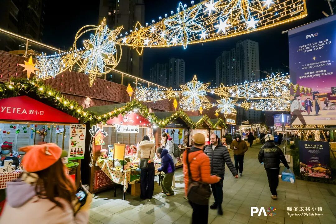 岁末之际,年味渐起。这几天,静安PAC购物中心的户外街区变了模样——巨型星形灯饰悬在半空,松枝缠绕暖光串灯,地面映着树影,整条街像被温柔点亮。夜幕降临时,灯光如星河倾泻,市民裹着围巾、端着热红酒漫游其间,仿佛走进了北欧童话里的冬日市集。