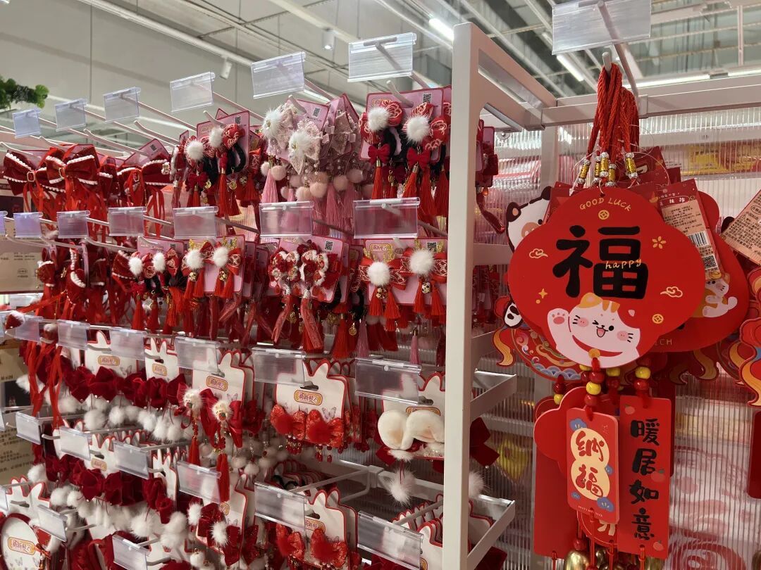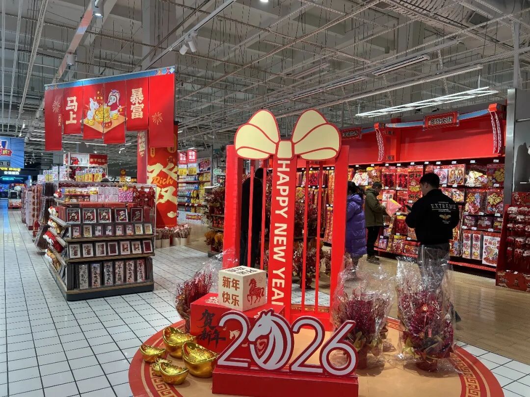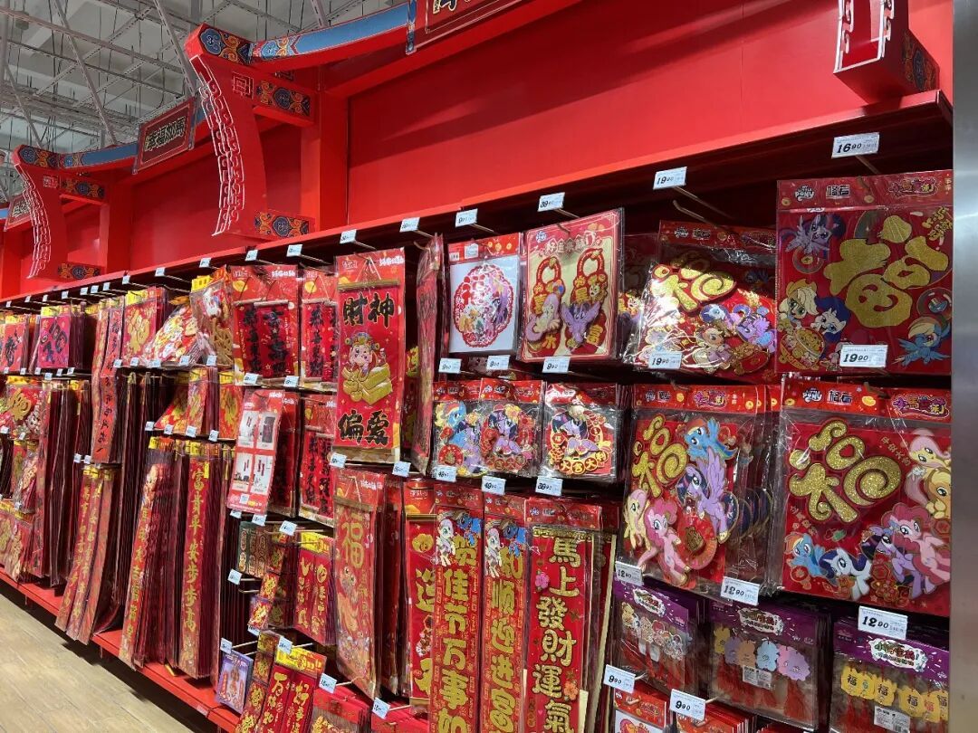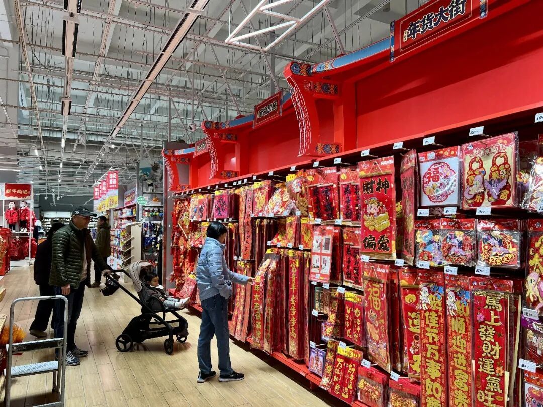 记者在现场注意到,“年货大街”位于卖场主入口区域,以一套喜庆的“新年装”亮相,十分醒目。春联、福字、吉祥挂饰、创意礼盒等上百种年节商品琳琅满目,凭借新颖的造型与喜庆的包装,成为顾客们争相选购的焦点。