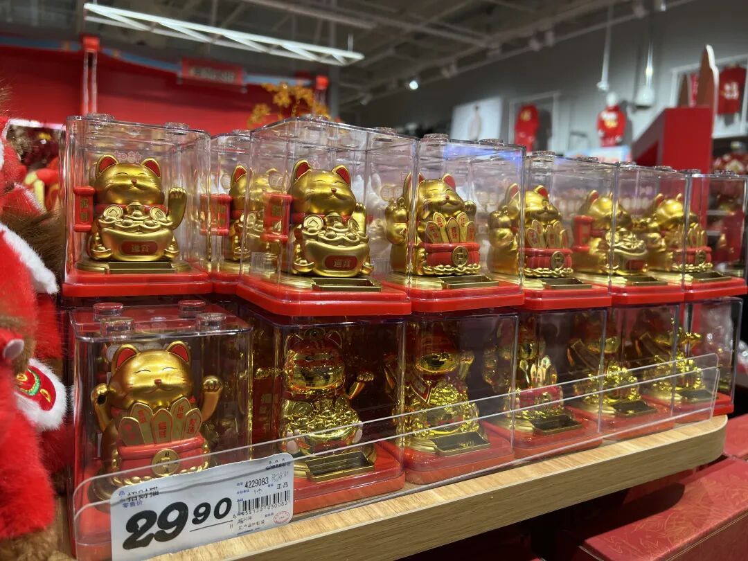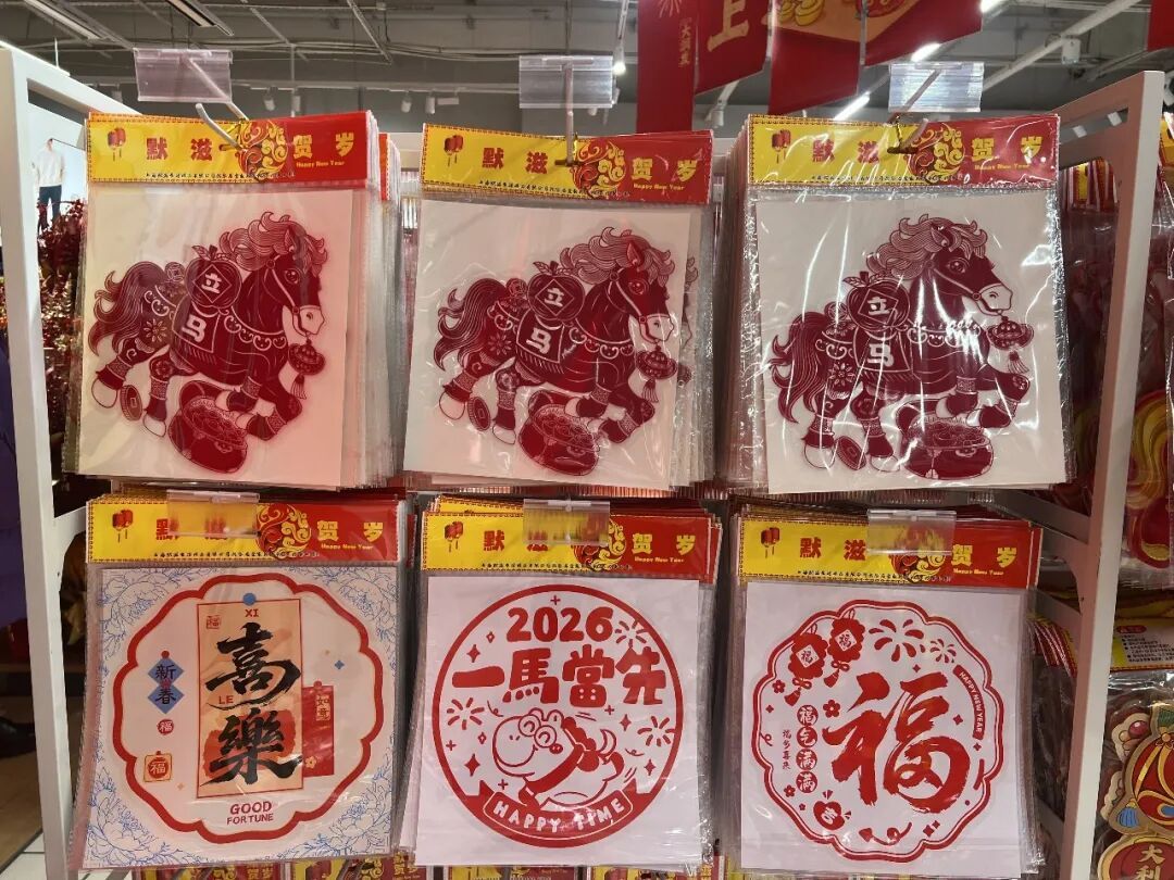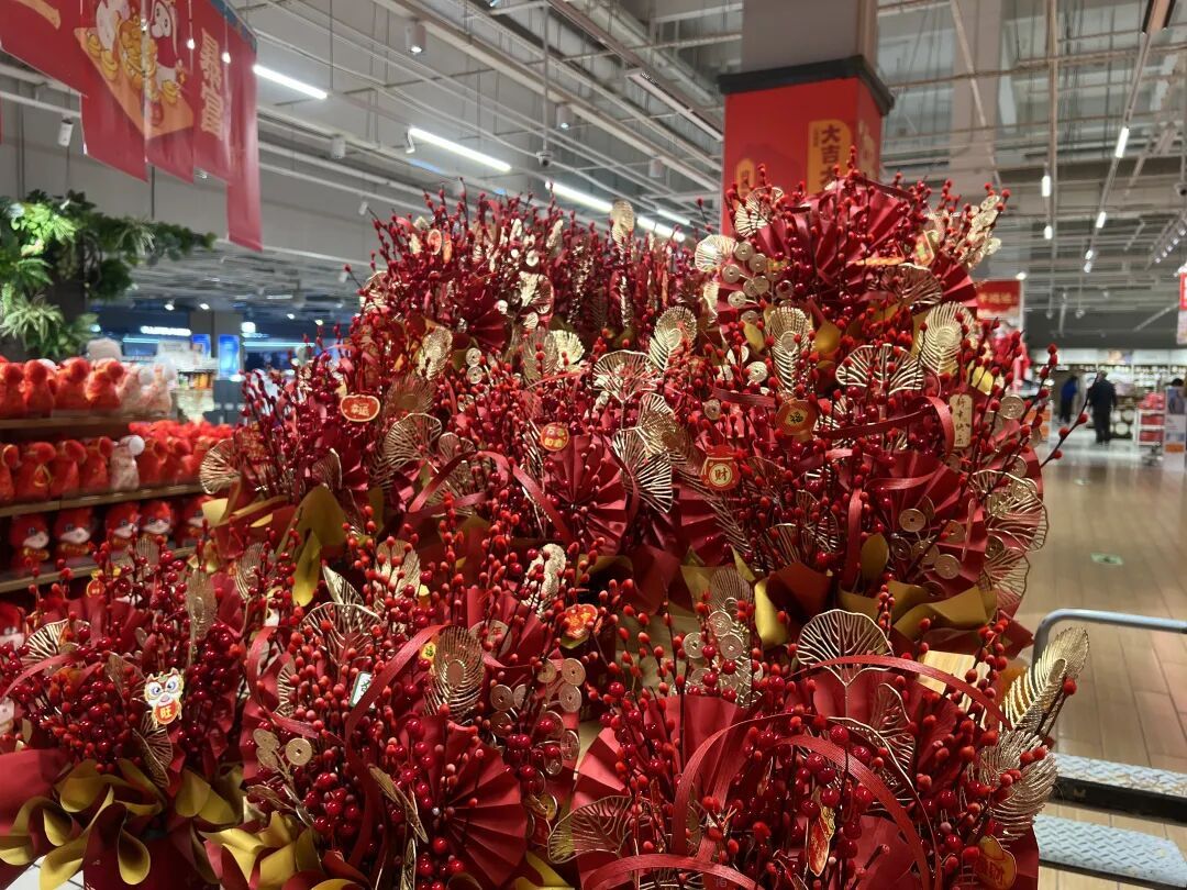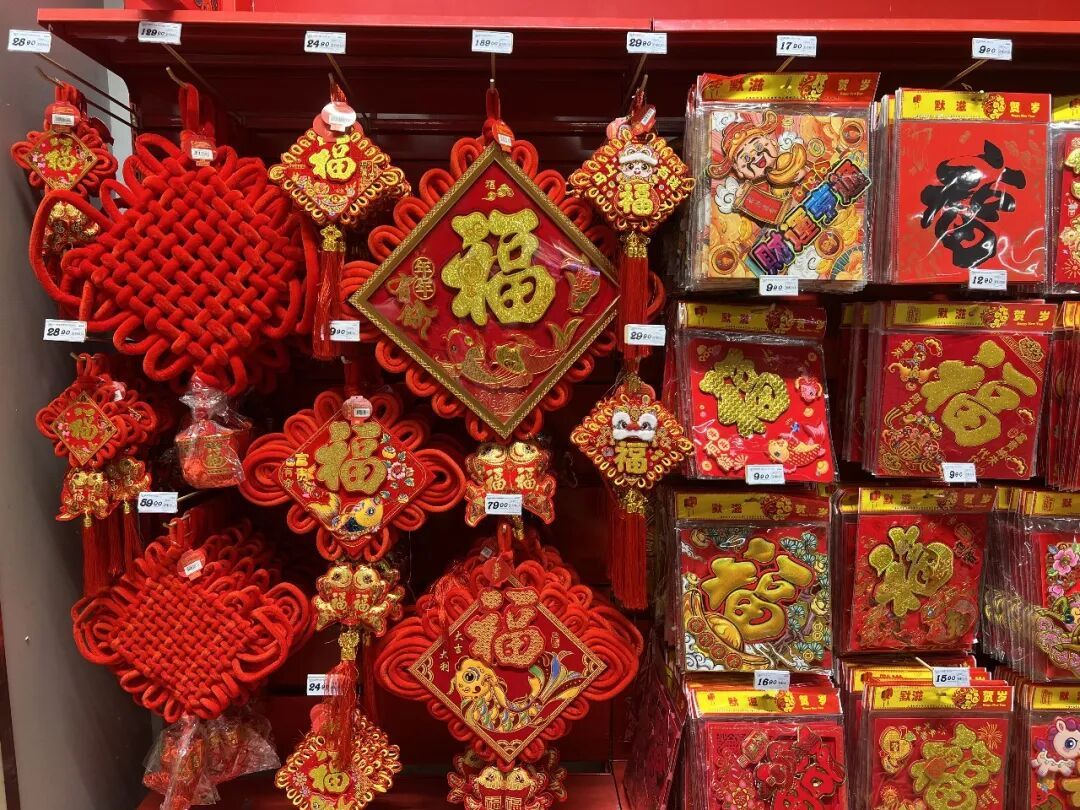 记者在现场注意到,“年货大街”位于卖场主入口区域,以一套喜庆的“新年装”亮相,十分醒目。春联、福字、吉祥挂饰、创意礼盒等上百种年节商品琳琅满目,凭借新颖的造型与喜庆的包装,成为顾客们争相选购的焦点。