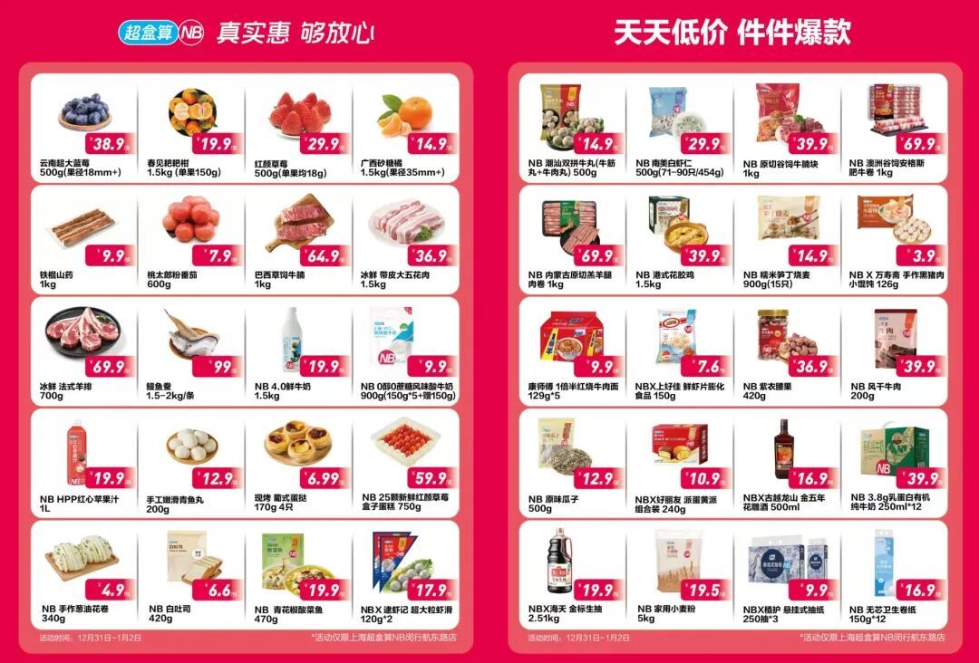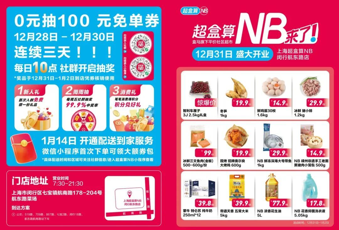 12月31日,盒马旗下硬折扣品牌“超盒算NB”闵行航东路店即将开门迎客。作为超火的平价社区超市,“超盒算NB”里的1500款好货覆盖生鲜、食品、日用百货,还有19.9元一盒的网红烤鸡、2块多一片的双拼瑞士卷、不到5毛一颗的鲜鸡蛋等品质好物。更多优惠,一起进店探寻吧~