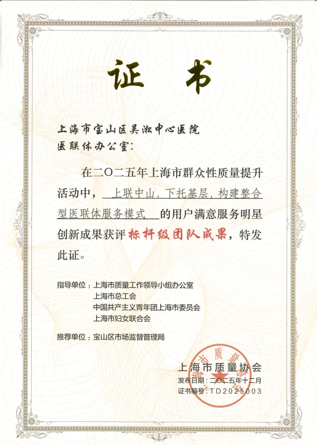 近日,由上海市质量协会主办的“2025年上海市用户满意服务明星创新活动”圆满落幕。宝山区吴淞中心医院(复旦大学附属中山医院吴淞医院)申报的“上联中山,下托基层,构建整合型医联体服务模式”荣获标杆级团队成果。