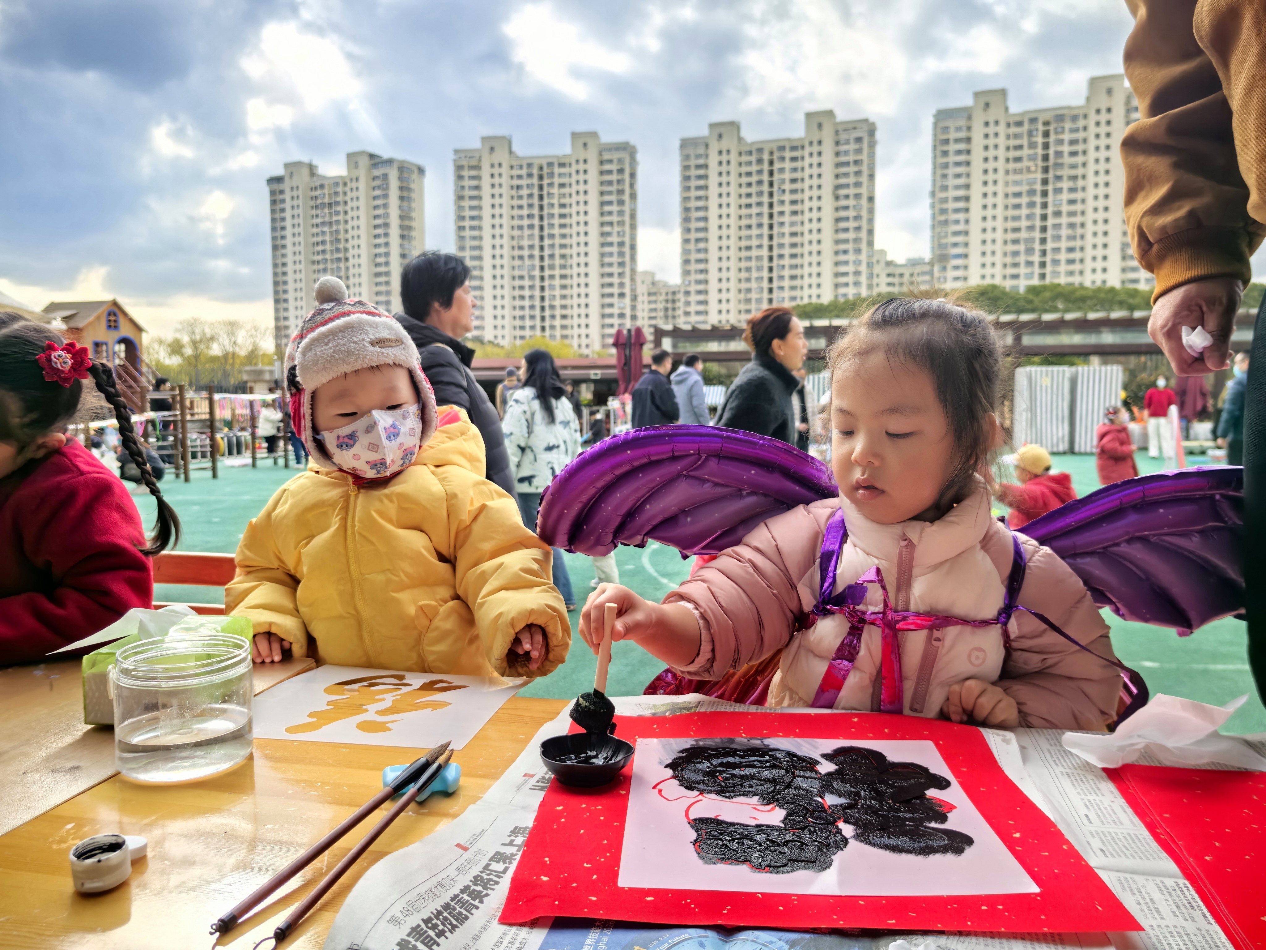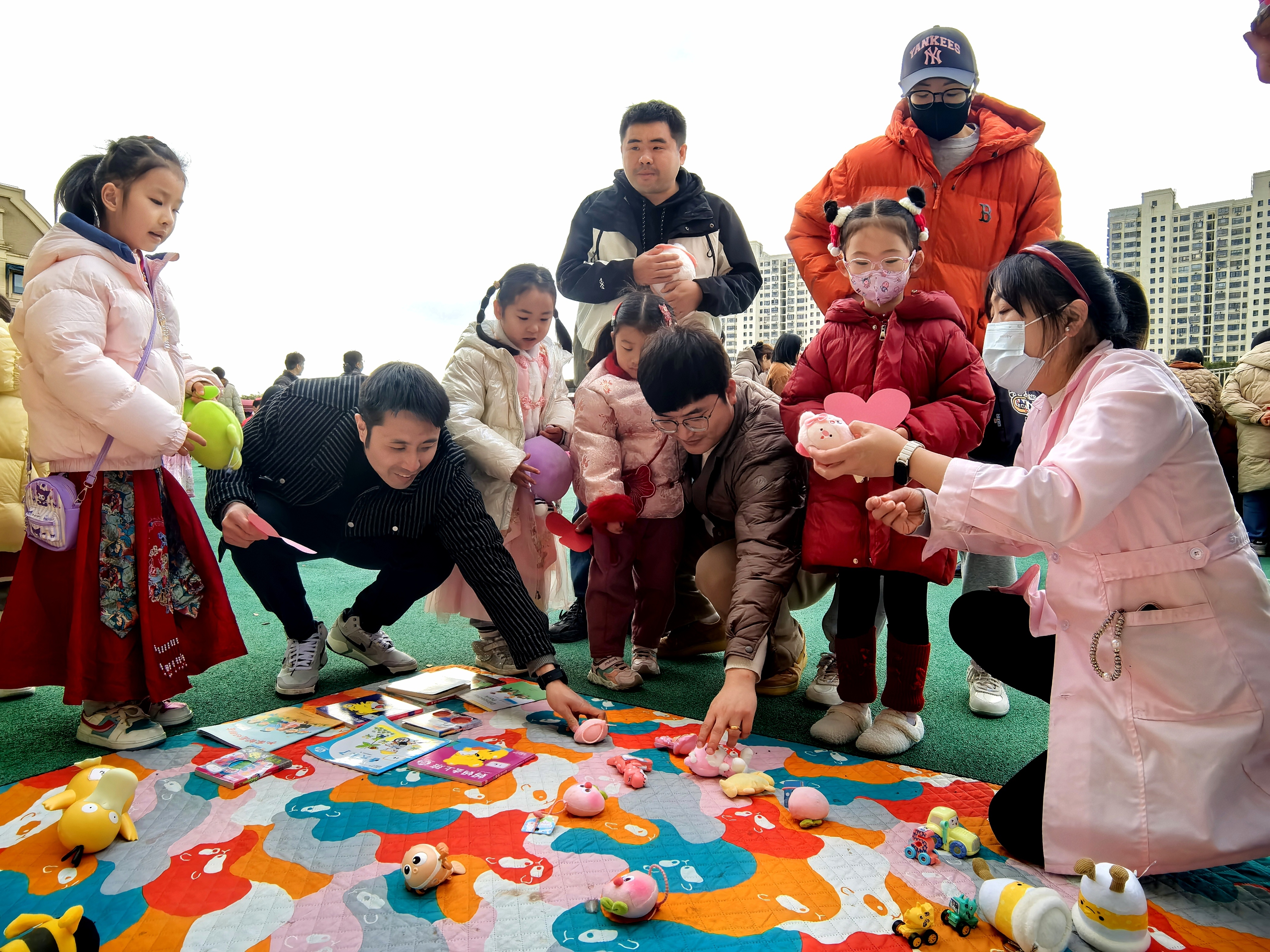 当天,幼儿园还准备了应景的迎新游戏。孩子们在家长的陪伴下,夹金豆、夹元宝、赶小猪、写福字,欢乐满园飞。家长黄垚杰说:“非常有意义的迎新活动,孩子们在参与义卖活动的过程中也得到了锻炼。”
