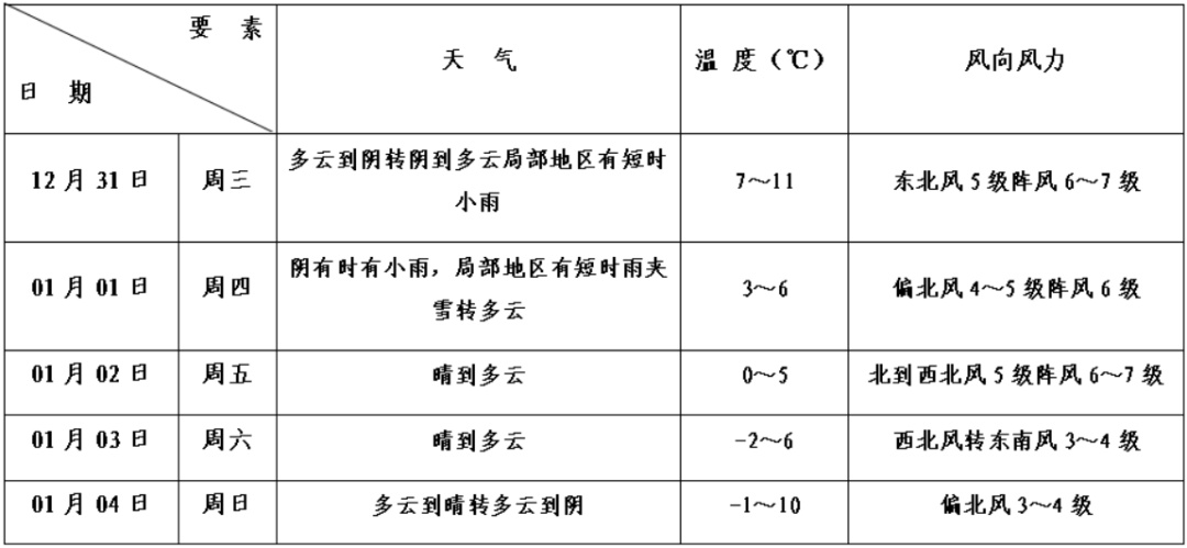 节后天气趋势:4日是新年的第一个工作日,本市多云为主,早间依然寒冷,白天最高气温回升至10℃左右。5日前后有冷空气扩散影响,云系增多,之后转为晴或多云为主的干冷天气,气温大体保持在1—10℃之间,在做好防寒保暖措施同时,也请注意用火用电安全。