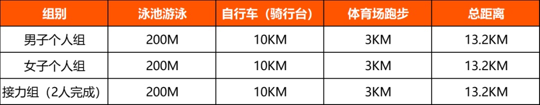 3. 接力组由两人接力按顺序完成游泳、自行车、跑步项目,项目分配无硬性规定,队员可自行安排;