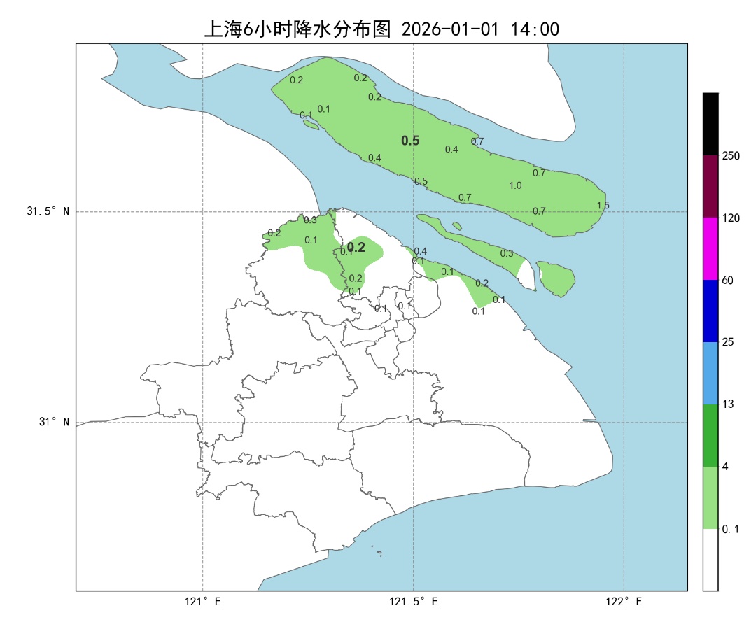 雨(雪)量并不大,但没有阳光,加上北风助力,新年第一天冬天的感觉很足!白天全市最高气温多在5~7℃,徐家汇站6.0℃。目前,多个郊区寒潮、大风、低温、霜冻、道路结冰预警生效中。今天夜间到明天早晨,出行还需留意交通安全,郊区低洼路面和桥梁有出现轻微道路结冰的可能。