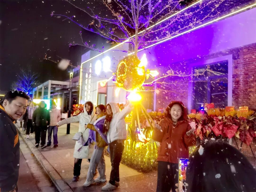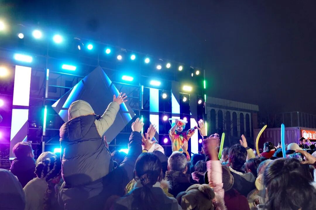 看完马戏,主舞台前的表演继续上演。乐队奏起激昂的电子音浪,鼓点震动空气。小吃摊位前也开始排队,摊主们忙得满头大汗,吆喝声、锅碗瓢盆的碰撞声、食客的赞叹声,汇成了最接地气的跨年交响曲。大家攥着热乎乎的小吃边走边逛,主街道突然“飘”起了人造雪花,人们纷纷涌过去,孩子们兴奋地蹦跳追逐,伸手去接飘落的“雪花”,家人相拥合影,定格浪漫时刻,感受着新年的幸福氛围。