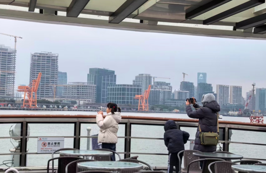 石先生带着爱人专程打卡这场主题航班。谈及游览感受,他的言语里满是感慨:“元旦能坐在浦江游览的船上,看徐汇西岸到黄浦滨江的风景,特别开心。平时都是在沿岸看,这次在江中心看两岸,感觉完全不一样。”虽然略带遗憾地提到天气不太配合,但他对浦江两岸的变化赞不绝口:“我在徐汇生活了五六十年,对这片土地感情很深。两岸的变迁,每一幕都记忆犹新,上海这座城市真的是越变越好了。”
