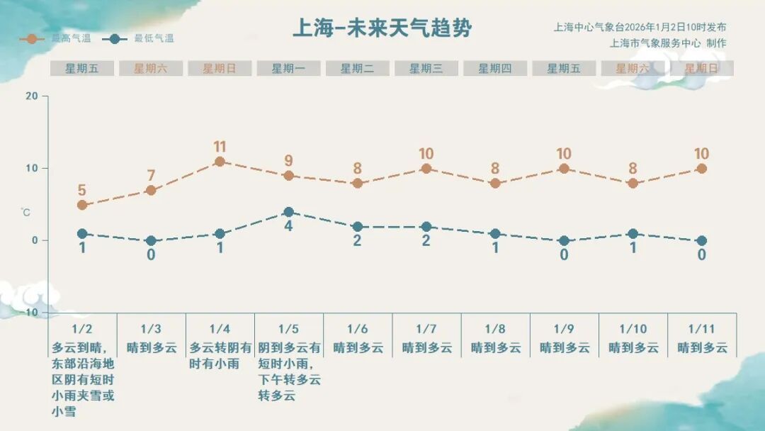 1月4日最高气温回升至两位数,4日夜间至5日上午有弱降水。下周以晴或多云天气为主,多冷空气扩散影响,气温难有明显回升,整体在0℃-10℃之间,大家还是要注意保暖。另外晴多雨少天气干燥,补水保湿外,也请注意用火用电安全。