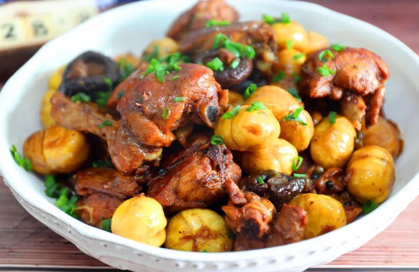 材料:鸡腿肉500克、去壳板栗200克、白糖、生抽、料酒、老抽、盐、葱、姜、蒜、食用油适量。