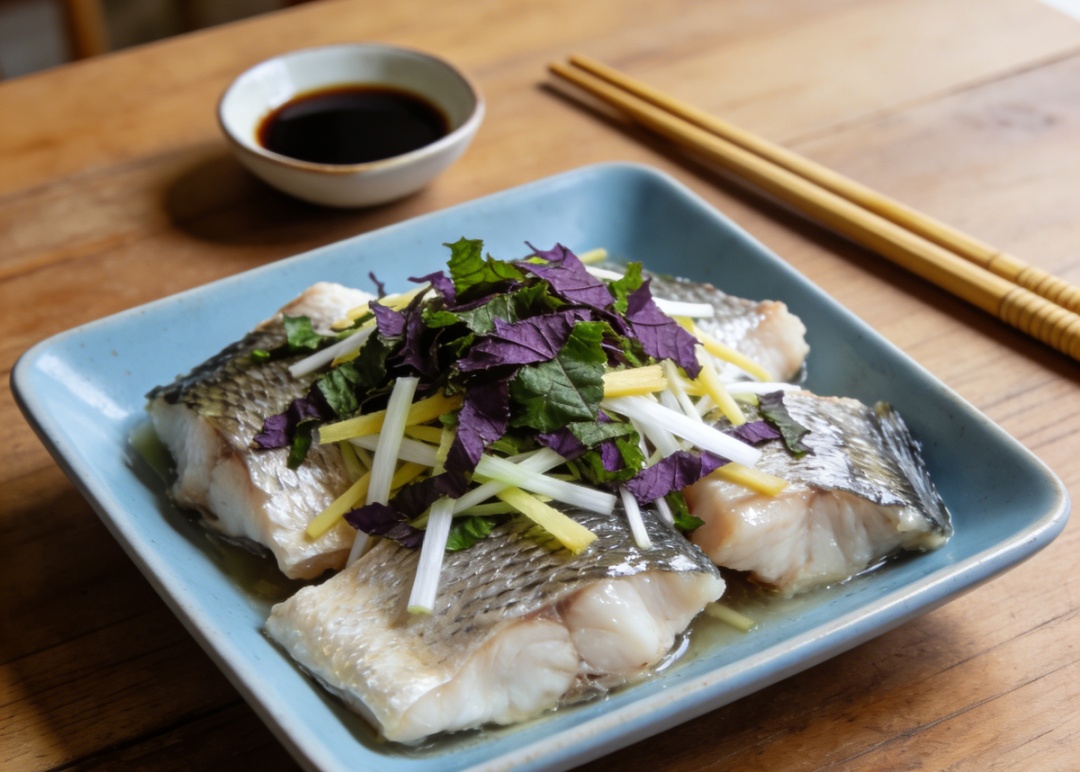 3.淋上热油,加入蒸鱼豉油和新鲜紫苏叶丝。