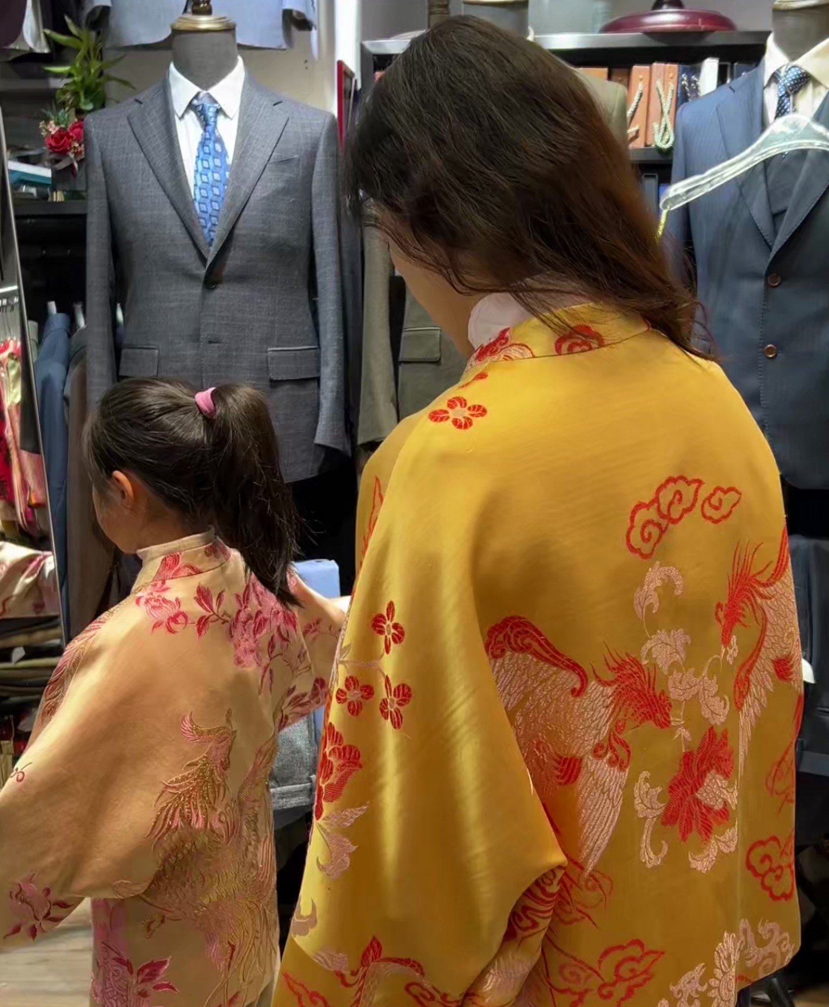 “我们有现成的款式让她们试穿,整个定制过程她们都全程参与。”店主说,“她们带了四块不同的老被面,我们就根据每个人的年龄和气质来搭配:蓝色给奶奶,大气庄重;黄色配妈妈,温柔清新;粉色给小姑娘,活泼又带点俏皮。”