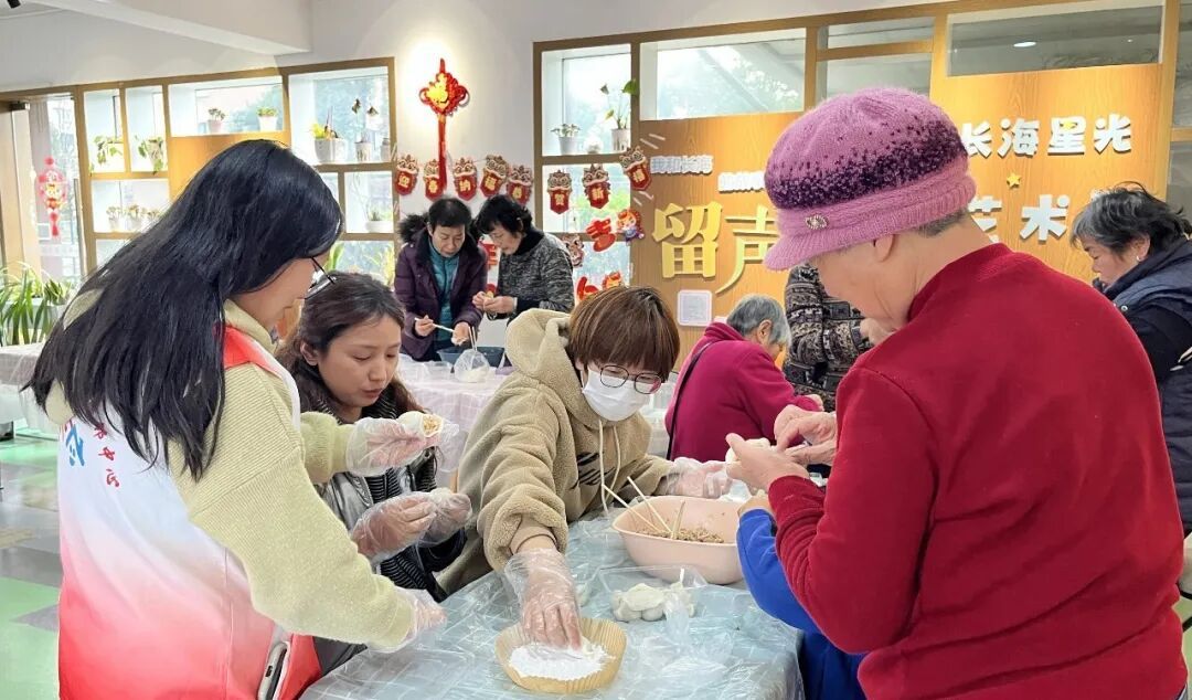 游园会的热闹,从睦邻中心一楼“团圆饺子共创区”率先开启。新鲜的馅料与面皮整齐摆上桌,居民们自发围坐,现场既井然有序,又满是烟火气。有山东老大爷享包饺子的小窍门,有萌娃创新捏出可爱的“小包子”,也有邻居“小姐妹”相约来跨年,邻里间闲话家常、互帮互助,笑声里满是节日的暖意。