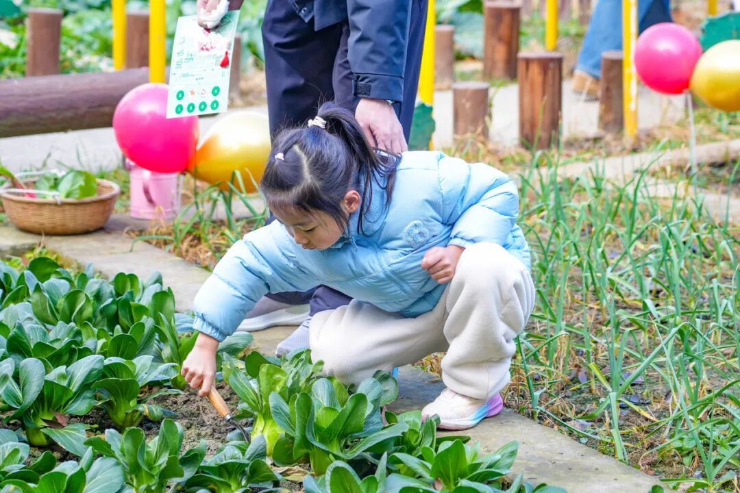 热身过后,精彩的亲子游戏正式拉开帷幕。在幼儿园的叮当林里,正在开展“叮叮当当”的游戏,家长和宝贝们默契配合,在清脆的声响中玩得不亦乐乎。而另一边的农家乐菜园,家长带着宝贝穿梭在蔬菜田地间,体验采摘的乐趣,新鲜的蔬菜捧在手心,满是收获的喜悦。