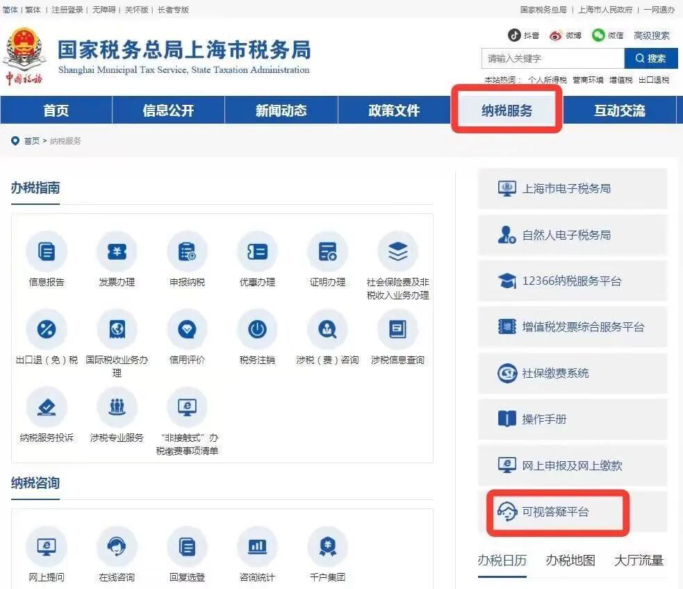 2.电脑端:上海市税务局官方网站-首页“纳税服务”标签-右侧列表-可视答疑平台