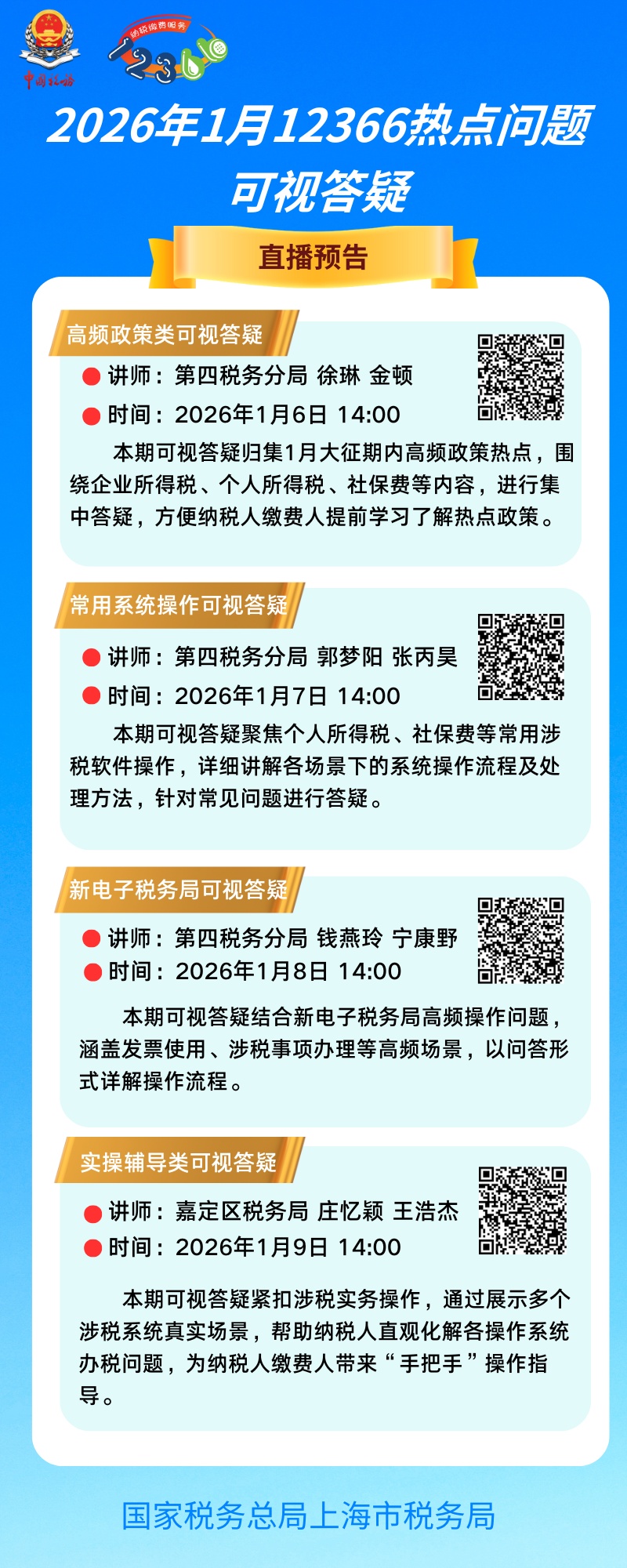 2026年1月适逢“大征期”,我们为纳税人缴费人朋友们准备了四场12366热点问题的可视答疑,分别涵盖政策知识、新电子税务局、常见税费系统操作等内容,希望能及时解答您在办税过程中的疑惑(详见下方长图)。
