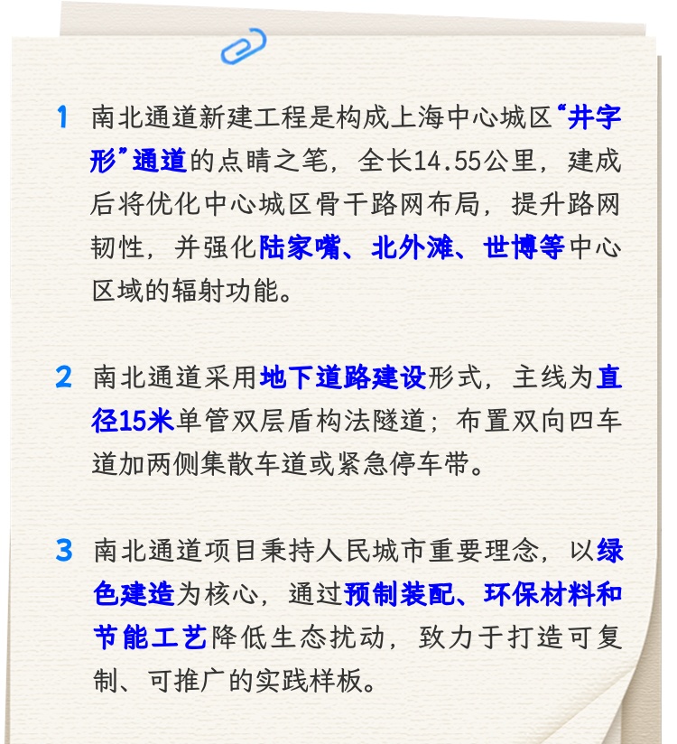 1月2日上午10时,南北通道新建工程开工,“十五五”重大交通项目建设扎实开局起步。该工程北起中环大柏树立交,沿曲阳路在中山北二路以北入地后,经曲阳路、曲阳南路、临平路、高阳路、浦东南路、浦三路,南至杨高南路成山路交叉口以北,全长14.55公里,是构成上海中心城区“井字形”通道的点睛之笔。