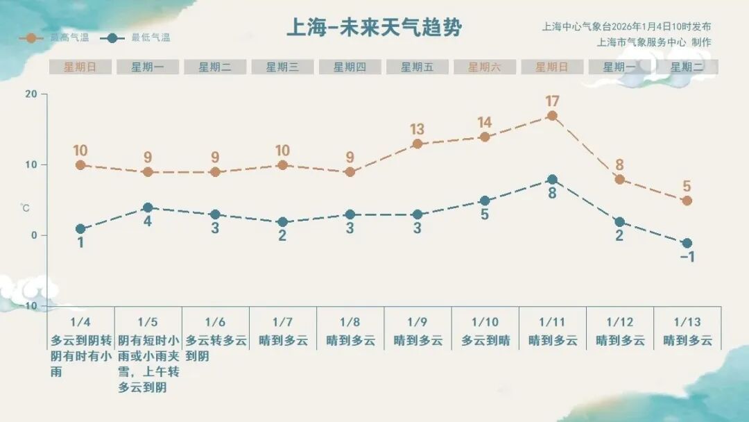 受高空短波槽东移影响,申城今天(1月4日)云系有所增多,白天天气以多云到阴为主,今夜到明天上午将迎一次小雨天气过程,风向由东到东南转为西北风。气温方面,今晨各郊区的最低气温仍在冰点以下,市区徐家汇站1.5℃,全天气温在1~10℃。