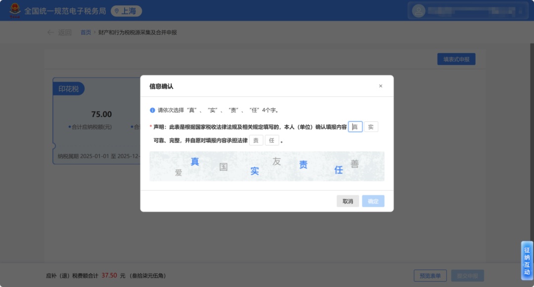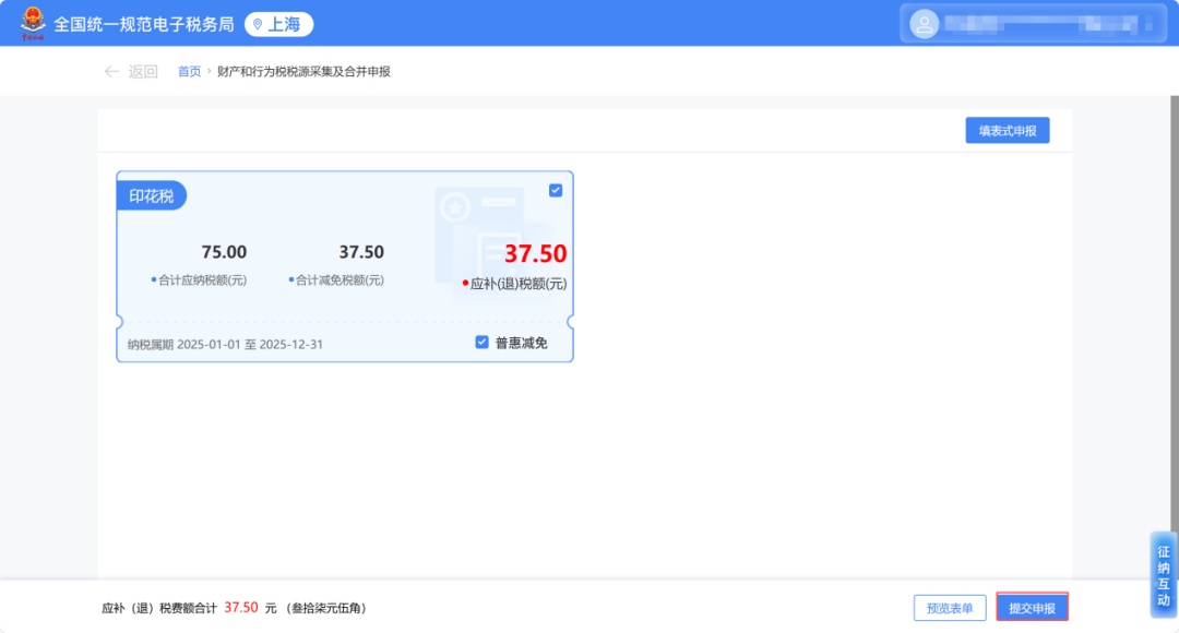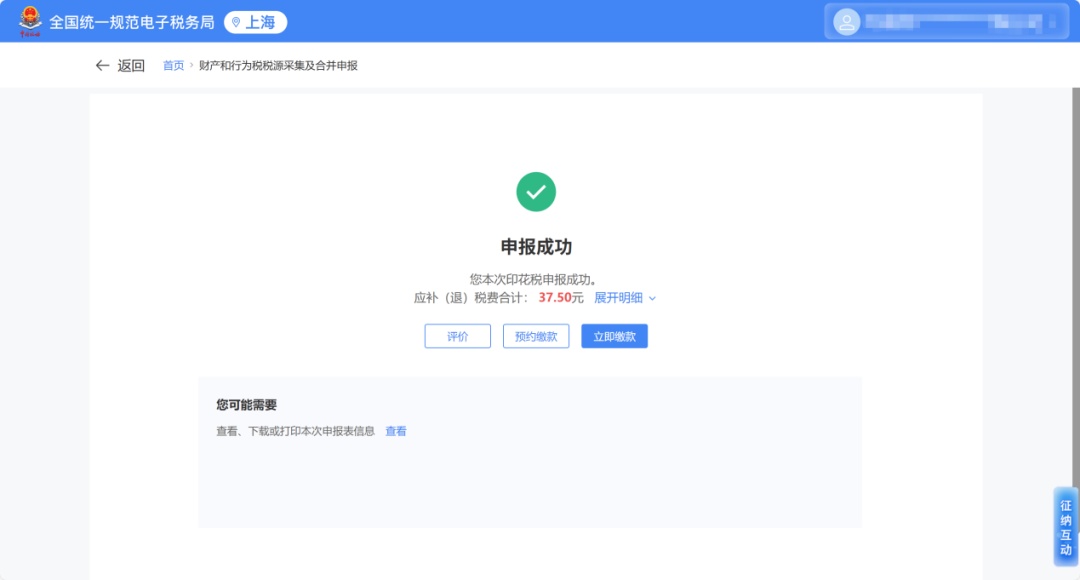系统将返回【财产和行为税税源采集及合并申报】页面,页面展示您已采集的待申报印花税税源卡片。如您符合享受“六税两费”优惠政策的条件,系统将默认勾选“普惠减免”,并在印花税税源卡片上显示合计减免税额。确认无误后,点击“提交申报”,信息确认页面输入“真实责任”,点击“确定”,跳转申报成功页面。如您有待缴税费的,您可以点击“立即缴款”或进入【税费缴纳】模块进行缴纳。