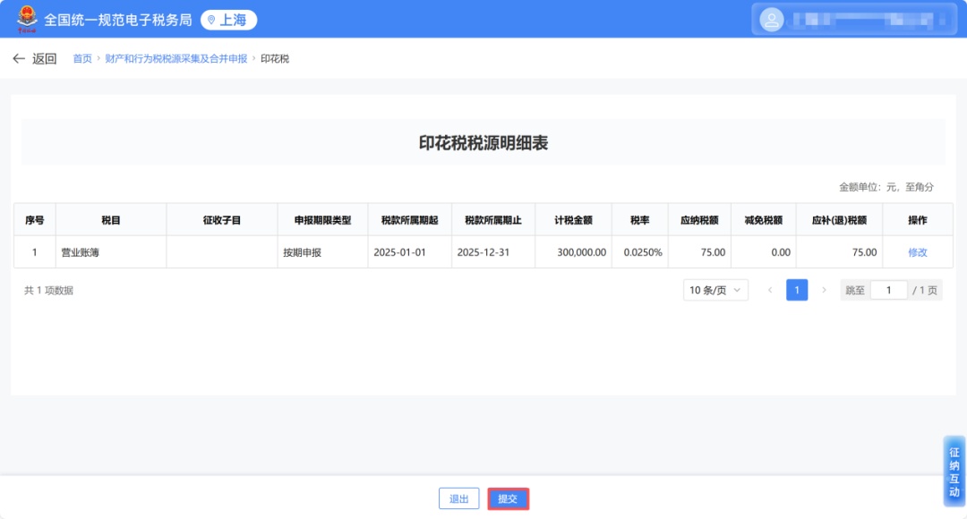 系统将返回印花税税源明细表页面,并显示已填写的税源信息,确认无误后点击“提交”按钮。
