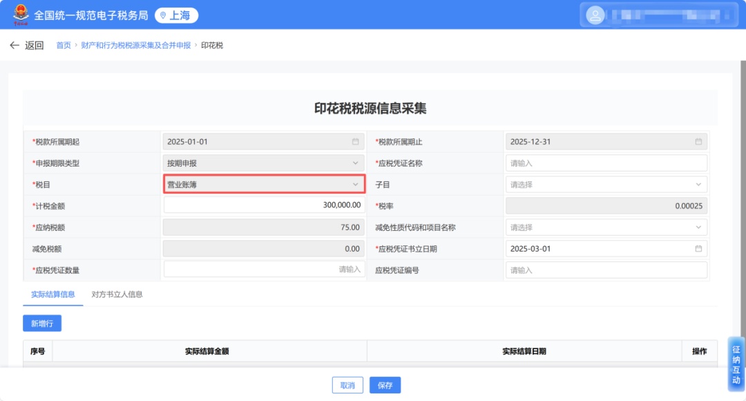 进入印花税税源信息采集页面后,税目选择为“营业账簿”,根据您的实际情况填写应税凭证名称、计税金额等信息。确认无误后点击“保存”提交。