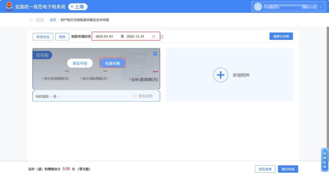 登录新电子税务局,依次点击【我要办税】-【税费申报及缴纳】-【财产和行为税税源采集及合并申报】,进入功能页面,上方的税款所属时间栏中选择您需要申报的所属期,点击新增税种,选择印花税,点击税源采集。