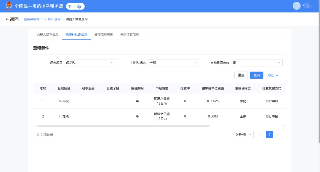 点击【税费种认定信息】,系统会显示当前企业有效税费种认定信息。“征收项目”选择“印花税”,点击查询,即可查看当前企业印花税税源认定信息。