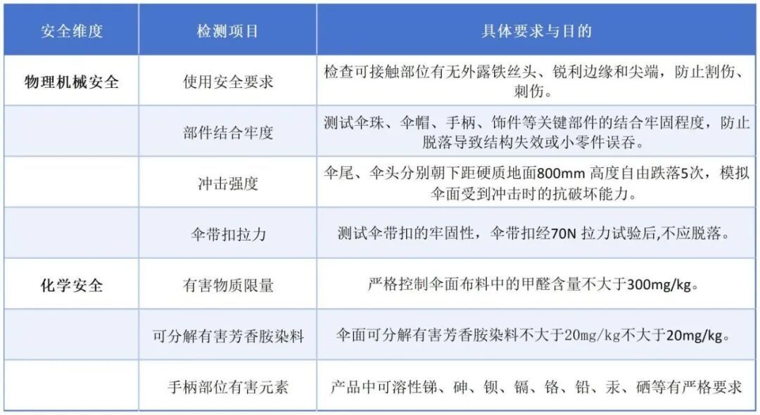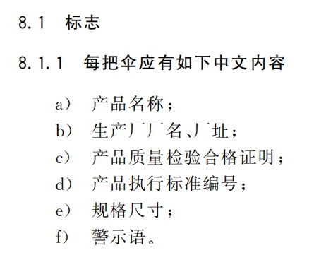 技术要求详解 作为强制性国家标准,GB 28477的核心在于设立了一系列细致入微的安全底线,主要涵盖物理机械安全和化学安全两大方面。 此外,在产品标志上也有要求,明确每把伞应有如下中文内容: 03