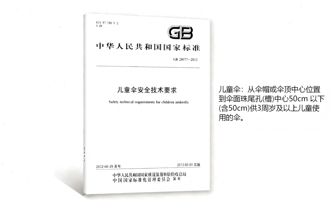 在超市琳琅满目的货架前,孩子一眼就被印着卡通图案的儿童伞吸引。然而一把色彩鲜艳、造型可爱的儿童伞背后可能藏着铁丝头外露、部件易脱落等意想不到的安全隐患,你知道吗? 作为家长,除了满足孩子的喜好 你是否仔细检查过这把伞是否真的安全? 别担心!有GB 28477-2012《儿童伞安全技术要求》 守护孩子手持的这片“小天空”安全! 01