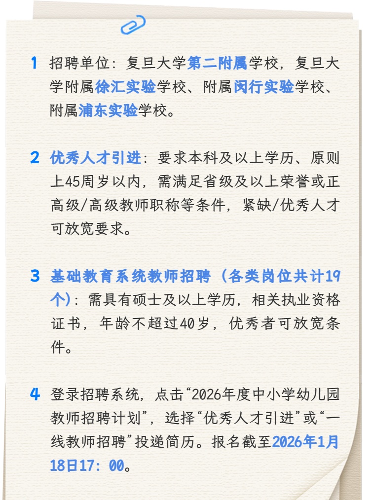 为进一步提升复旦大学附属中小学办学水平和教育质量,优化基础教育师资队伍结构,复旦大学2026年度基础教育优秀人才引进和教师招聘工作启动。