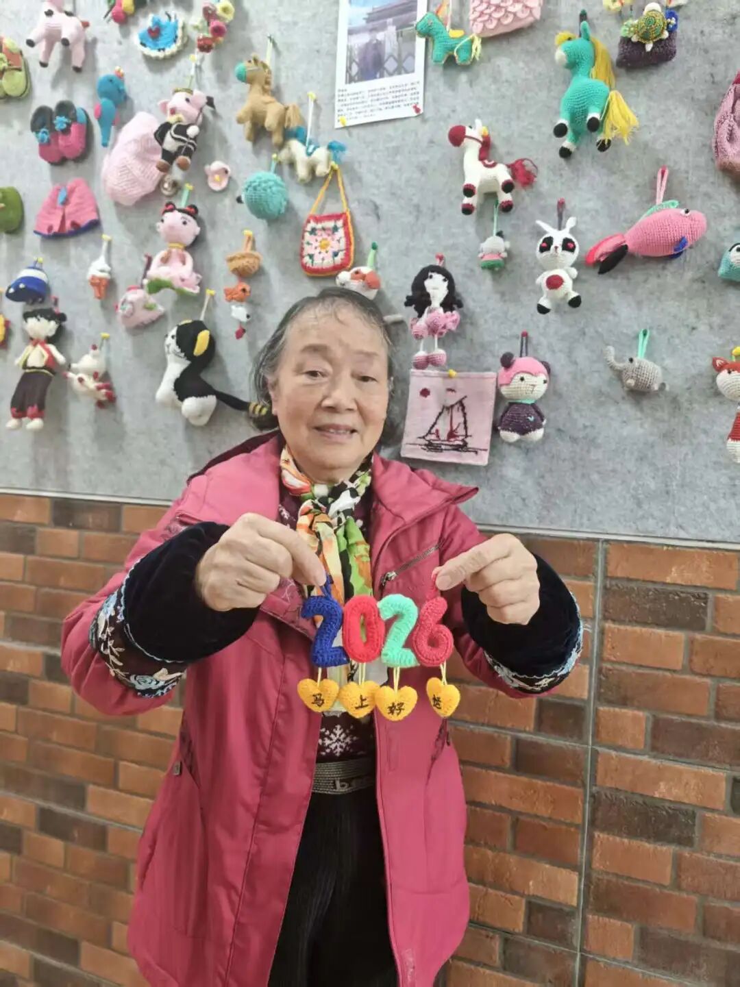 马年新春临近,年味渐浓情更暖。在吴泾镇虹景二居,75岁老人孙跃妹耗时近半个月,以一针一线钩织出五匹姿态各异的绒线小马驹和2026“马上好运”的吉祥字样送至社区居委会,为邻里送上最质朴的新春祝福。