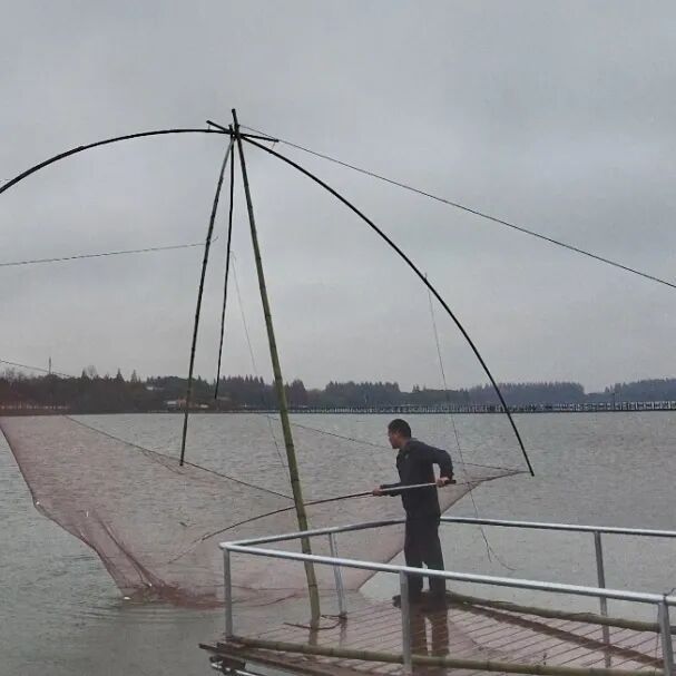 在明珠湖7字型浮桥上设置4-6处搬罾网,供游客体验古法捕鱼。