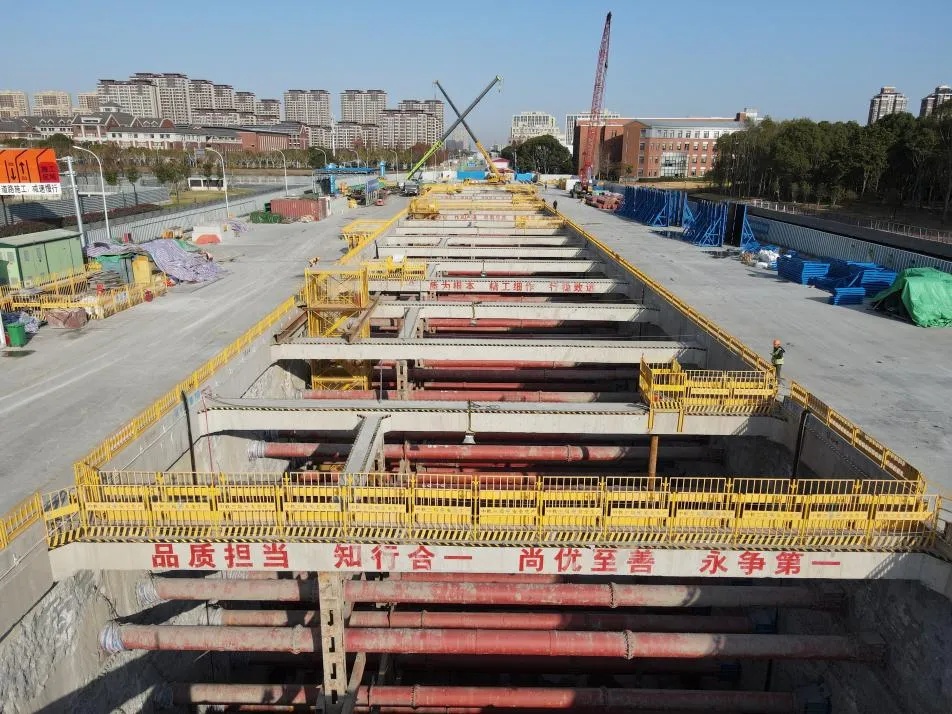 东方美谷大道作为上海轨道交通15号线南延伸工程推进主体施工的关键站点,其施工面临多重挑战:车站最大开挖深度达20.44米,地处上海典型淤泥质软土区域,土体易变形、蠕变特性显著,且周边管线密集,110KV强电迁改曾是制约施工推进的核心难题。 为确保底板施工质量与安全,建设集团第五分公司以精细化管控为核心,构建全流程技术保障体系,创新破解软土深基坑施工难题。在前期筹备阶段,通过优化施工方案、优先推进无影响区域作业,高效破解强电迁改制约,同步完成86幅地下连续墙施工,构筑起严密的封闭防护屏障。针对软土地层特性,布设81根长30米、桩径850毫米的抗拔桩,100%开展桩身完整性检测与承载力试验,从源头稳控结构沉降;采用三轴搅拌桩进行地基加固,通过现场试桩优化搅拌速度、注浆压力、水灰比等关键参数。降水环节实施“精准降压、防突涌”策略,采用分级降压模式实时监测水头变化,按需降水,避免超降引发基坑失稳,保障周边建筑物安全。 底板施工过程中,严格执行“分层分段、对称浇筑”原则,引入可视化信息管理平台,对钢筋直螺纹机械连接、混凝土浇筑等关键工序实施全程监控。针对大跨度无柱拱形顶车站结构特点,运用无线智能伺服系统控制钢支撑应力变化,有效规避软土变形风险,形成可复用的“软土深基坑精细化管控技术”。所有底板混凝土浇筑均连续作业,项目部优化上翻梁浇筑方案,大幅缩短单块底板施工时间,用时28天完成底板封底,为后续站厅、站台等上层结构施工创造了有利条件。 20号线张杨北路站顺利完成第一阶段交通翻交